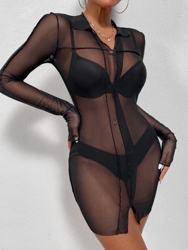 Top-Stitching Split Hem Mesh Bodycon Dress Without Lingerie,Summer Dresses For Women