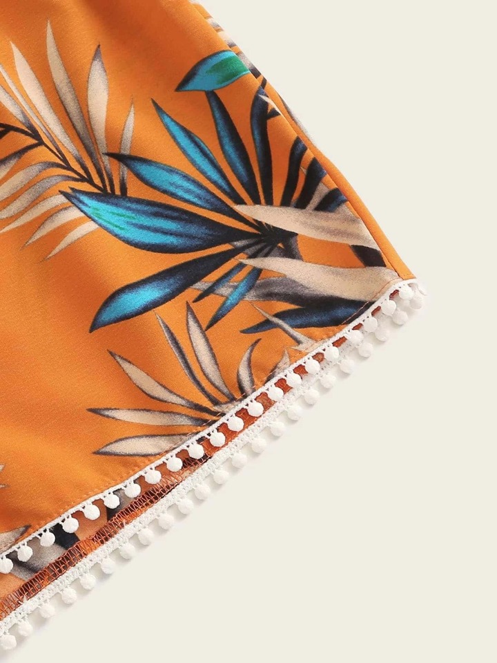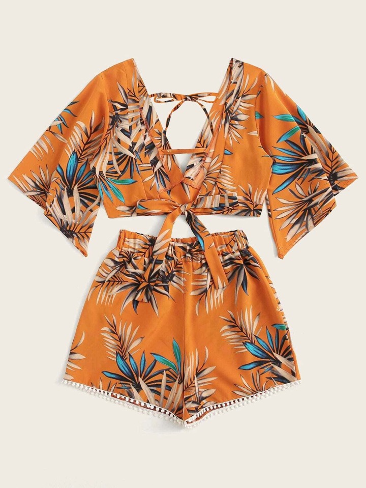 Tropical Plunging Crop Top & Pom Pom Shorts Set