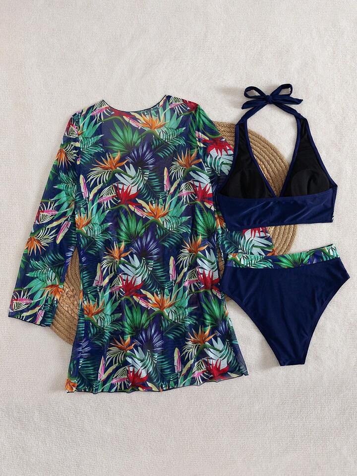 Tropical Print Halter Bikini Set With Kimono Matching Set,Summer Beach