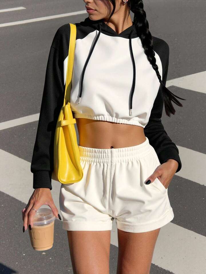 Two Tone Raglan Sleeve Drawstring Crop Hoodie Pullover Fall Outfit