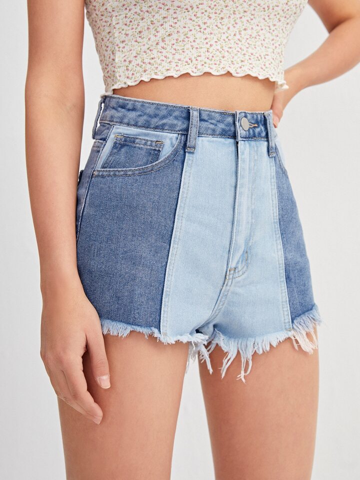Two Tone Raw Hem Denim Shorts