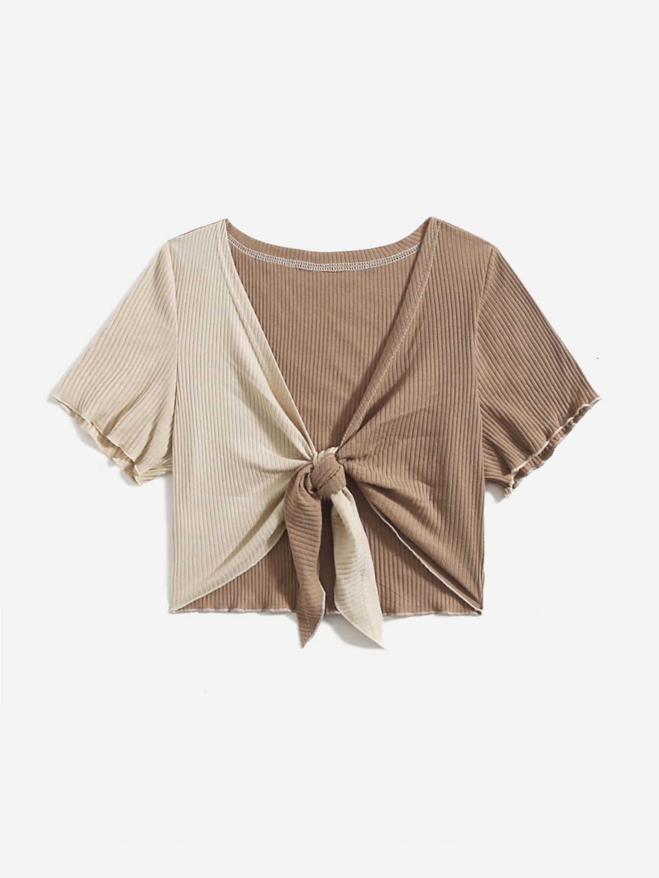Two Tone Tie Front Ribbed Top