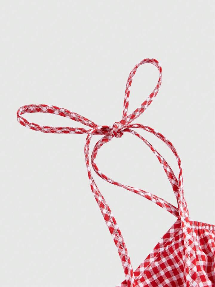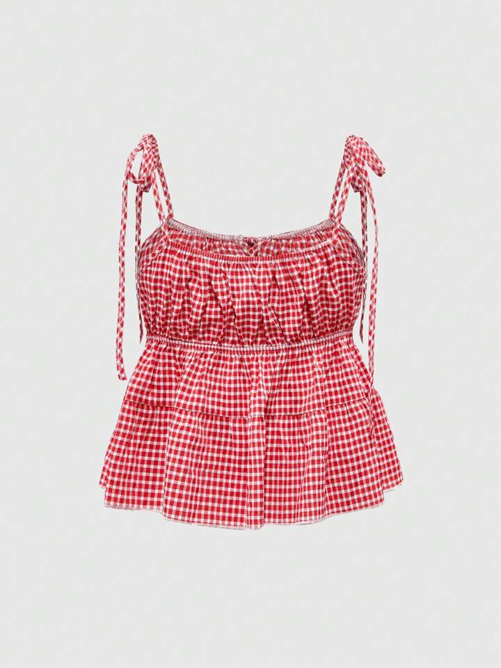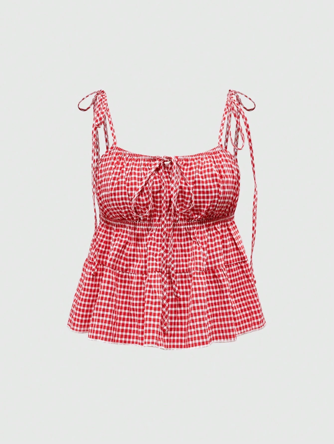 Vacation Style Lovely Gingham Peplum Backless Design Women Tank Top