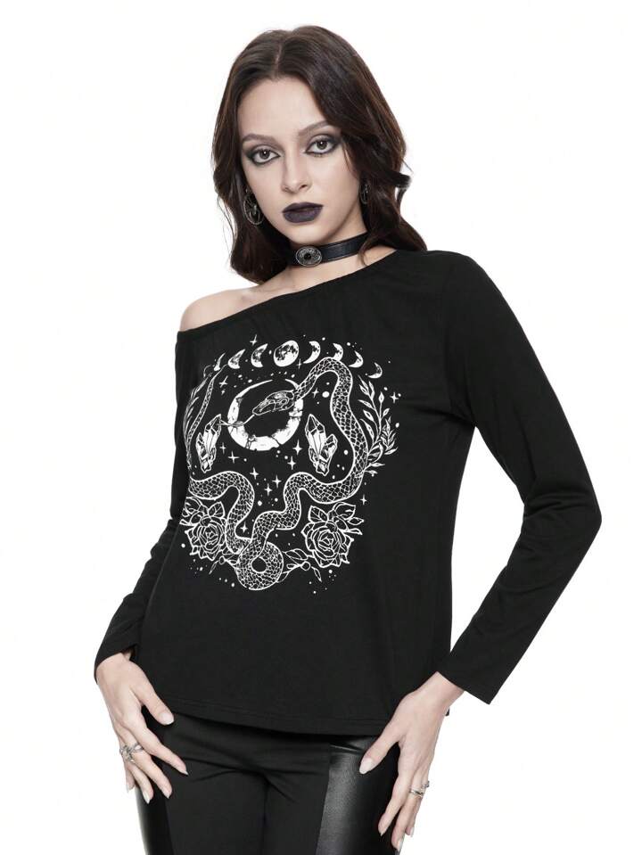 Vintage Gothic Oblique Shoulder Sun, Moon, Star, Snake & Rose Floral Diamond Print Knitted Elastic Long Sleeve Tops For Women