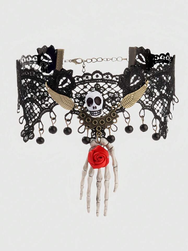 Vintage Gothic Style Skull Rose Palm Lace Necklace, Choker