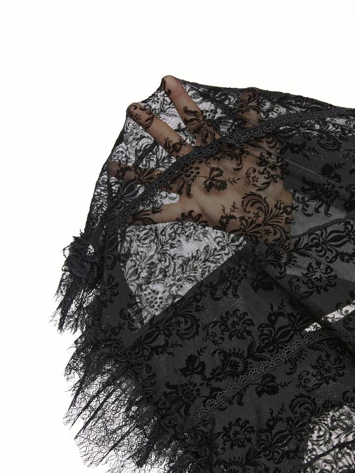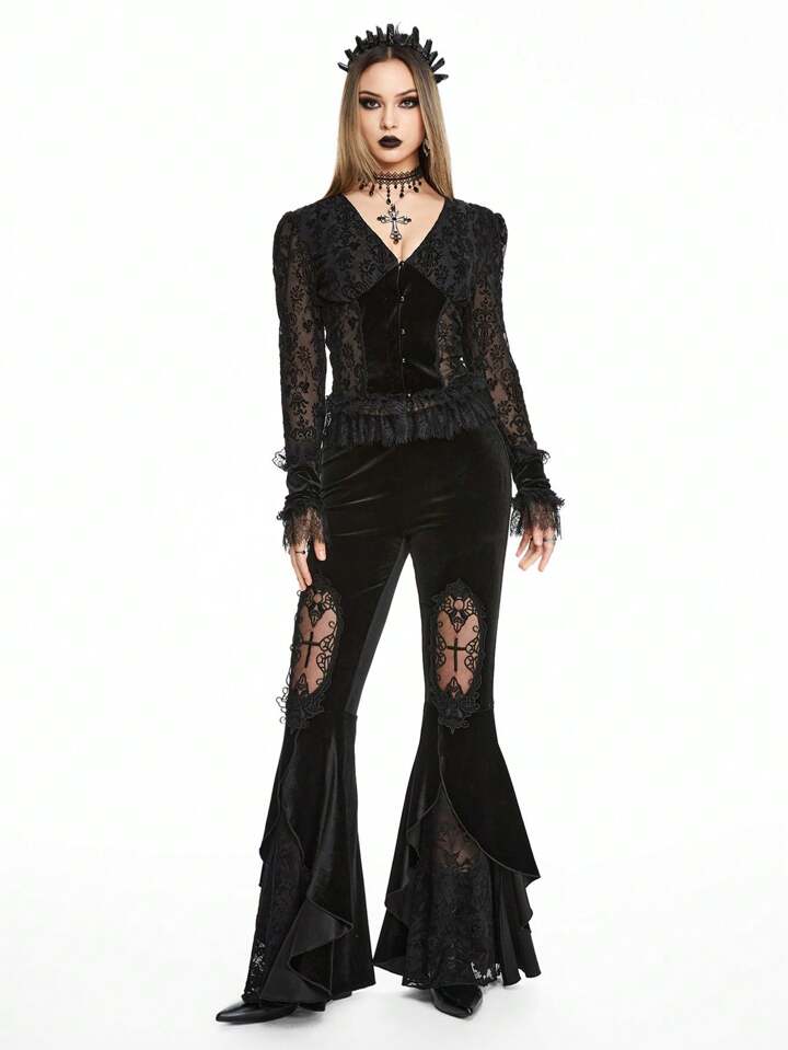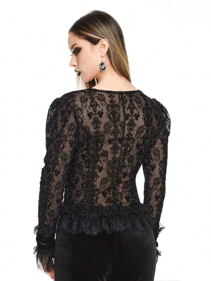 Vintage Palace Style Romantic Gothic Floral Vine Flocked Patchwork Lace Trim Bell Sleeve Blouse