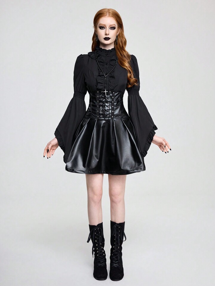 Vintage Punk Gothic Style Women's High Waisted PU Leather Buckle Belted Pleated A-Line Skirt