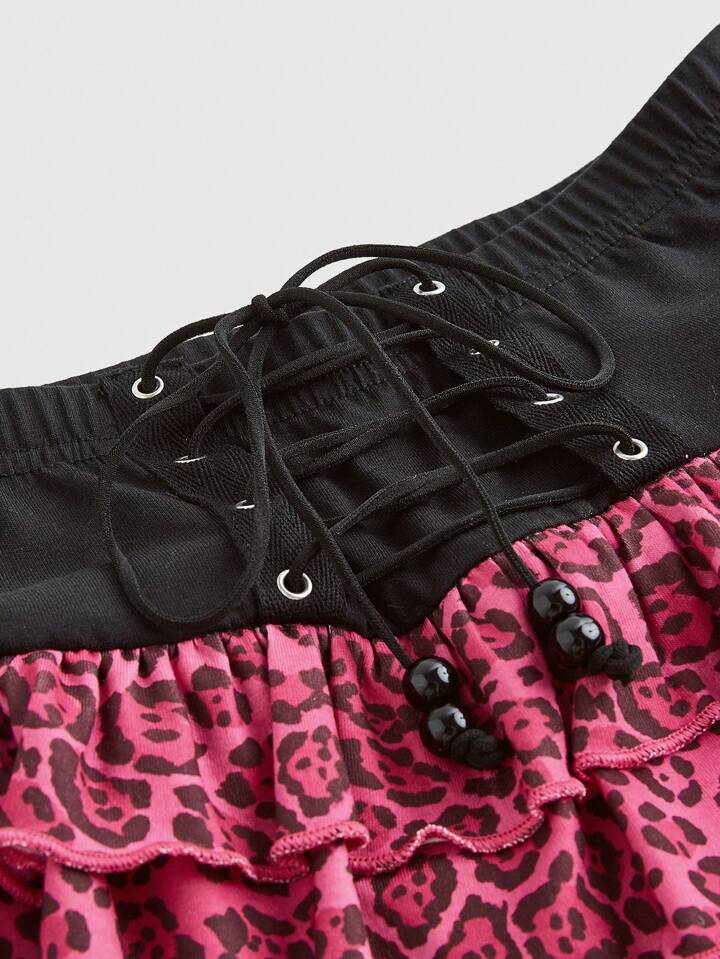 Vintage Y2K Hot Pink Leopard Print Layered Ruffle Drawstring Waist Skirt