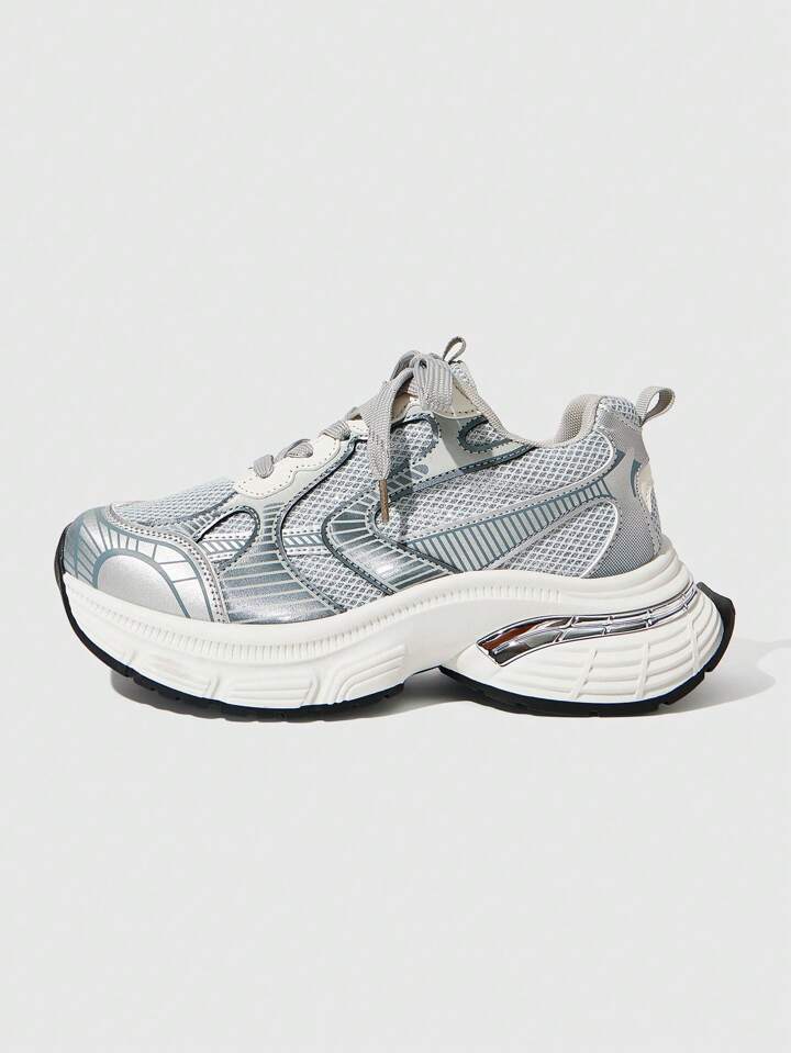 White Chunky Sneakers, Casual Sports Running Shoes, Silver Color Lightweight Comfortable Student Shoes, Women Platform & Thick Bottom Flats