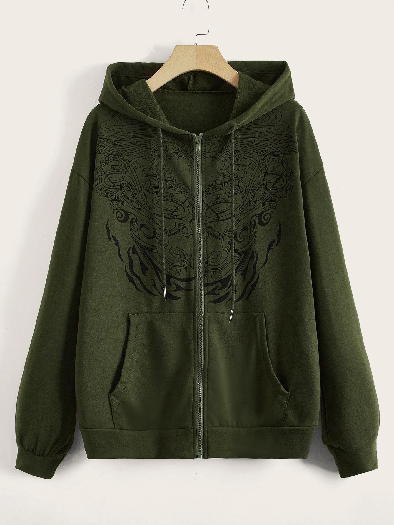 Wings Graphic Zip Up Pocket Drawstring Hoodie