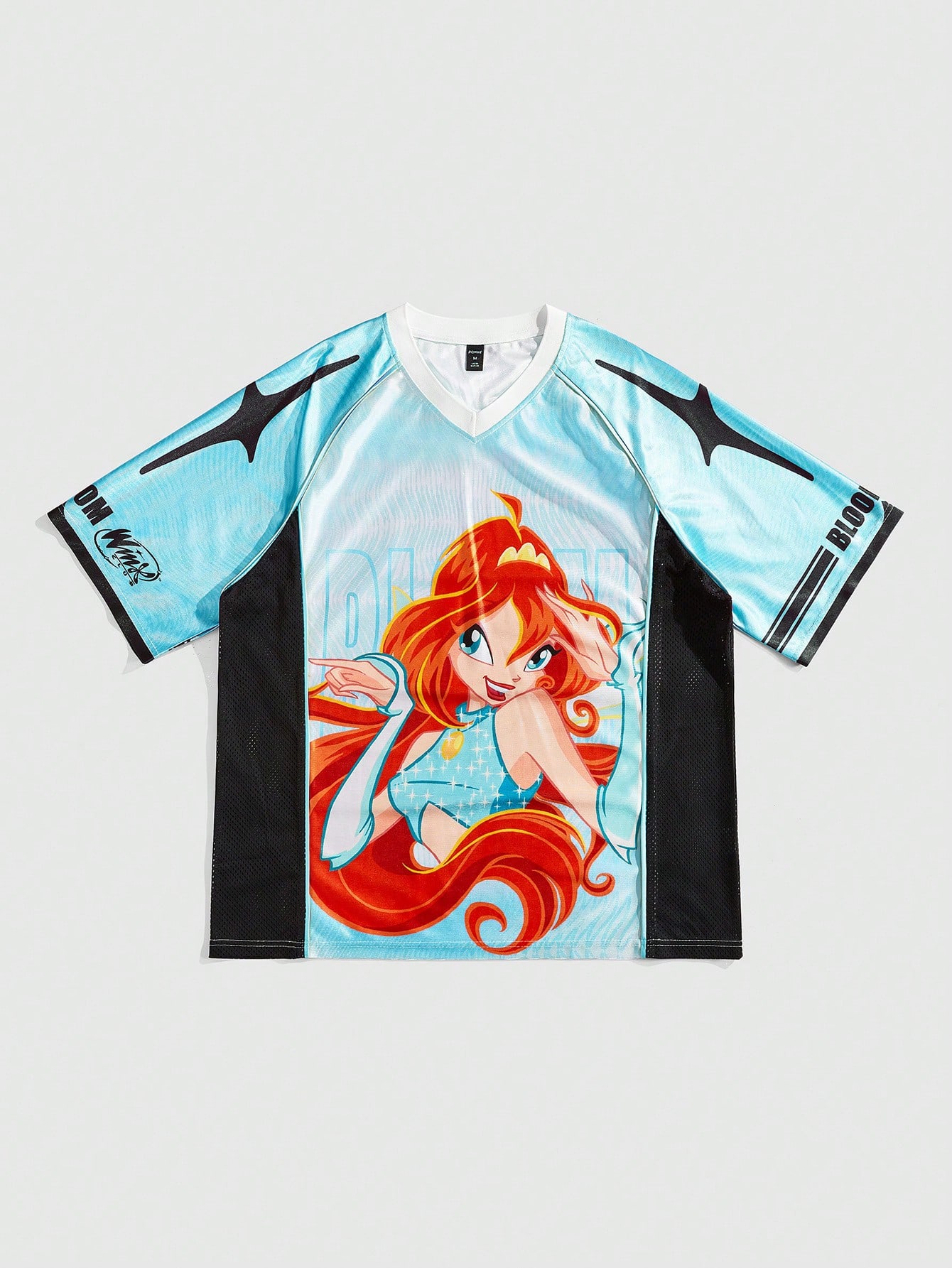 Winx Club X ROMWE Men's Casual Colorblock Cartoon Print V-Neck Short Sleeve T-Shirt