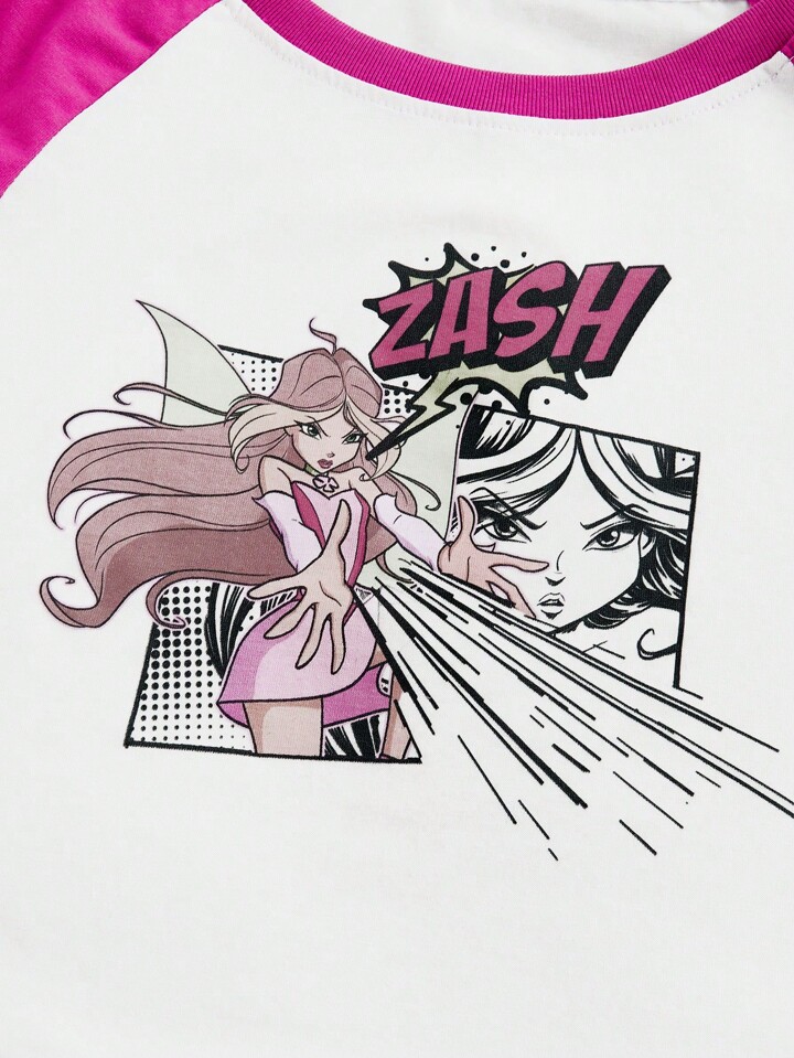 Winx Club X ROMWE Women's Y2K Casual Cartoon Character & Letter Contrast Color Raglan Sleeve Cropped T-Shirt, Summer