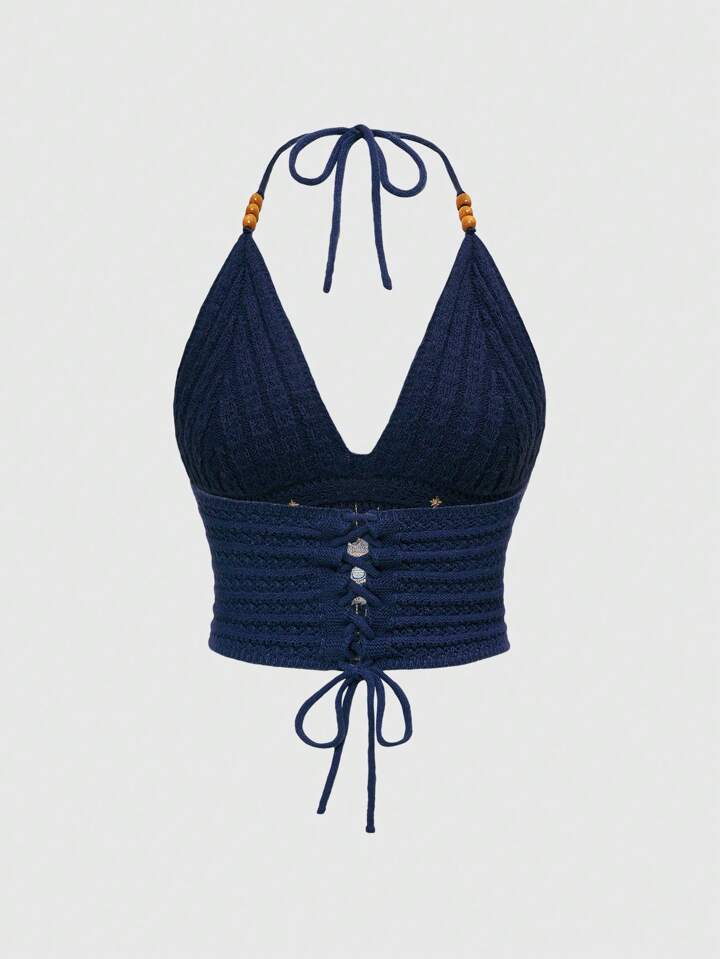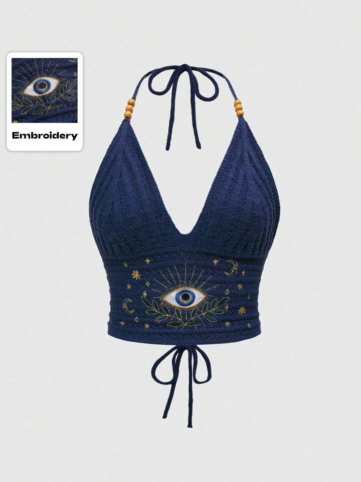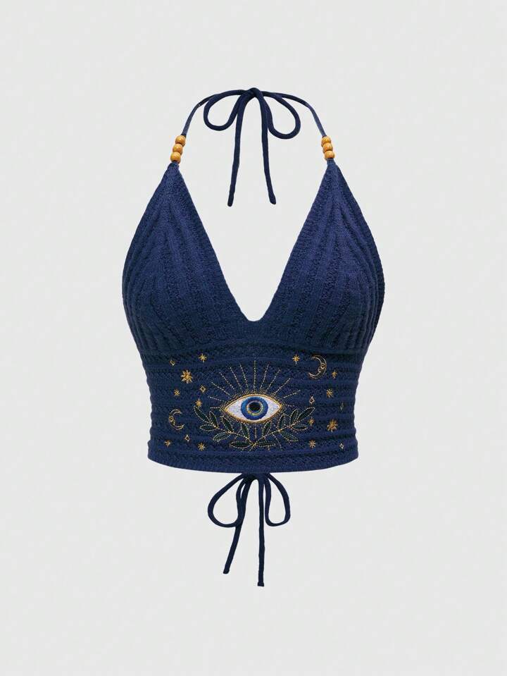 Women Boho Hippie Style Summer, Moon & Star Embroidery Knit Beaded Top