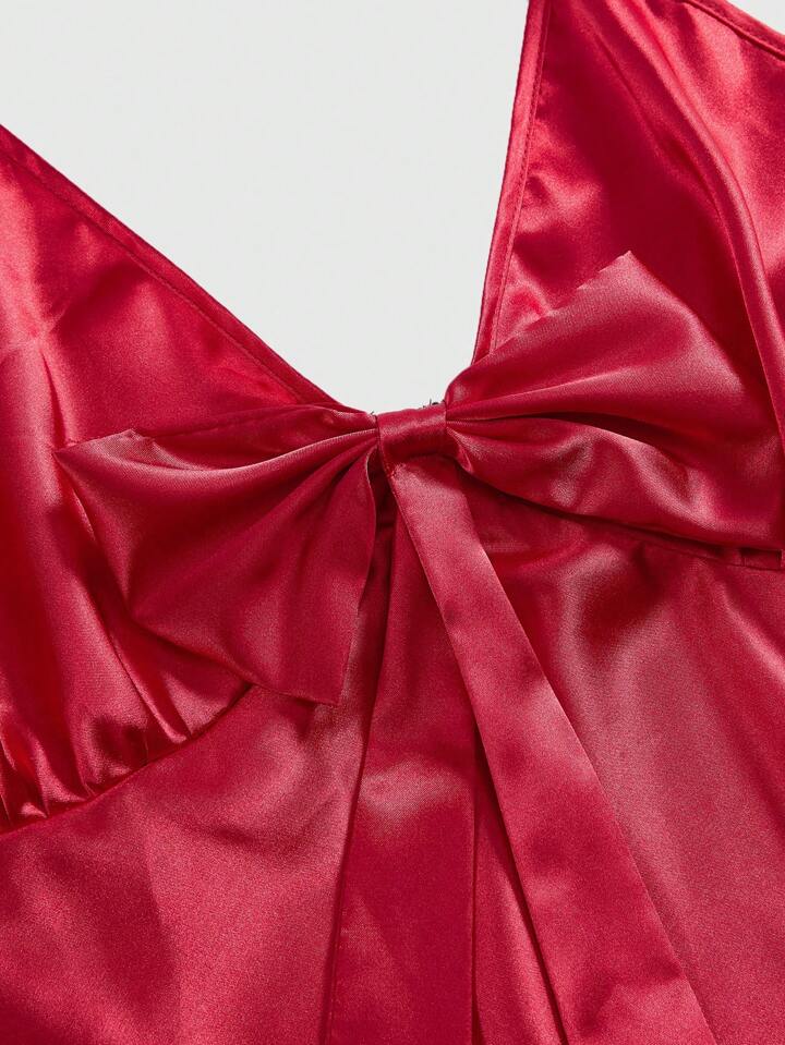 Women Plus Size Solid Color Bow Satin Camisole And Shorts Pajama Set