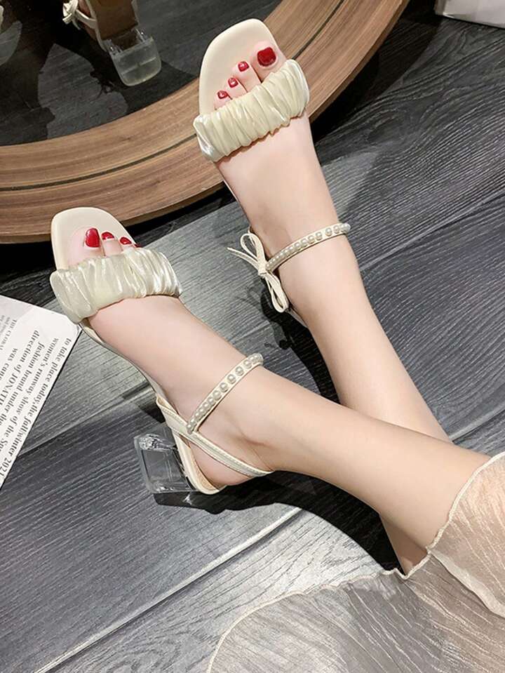 Women Ruched Decor Ankle Strap Sandals. Chunky Heeled Elegant Sandals