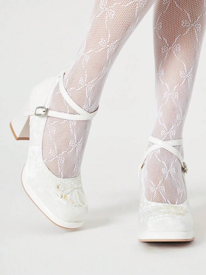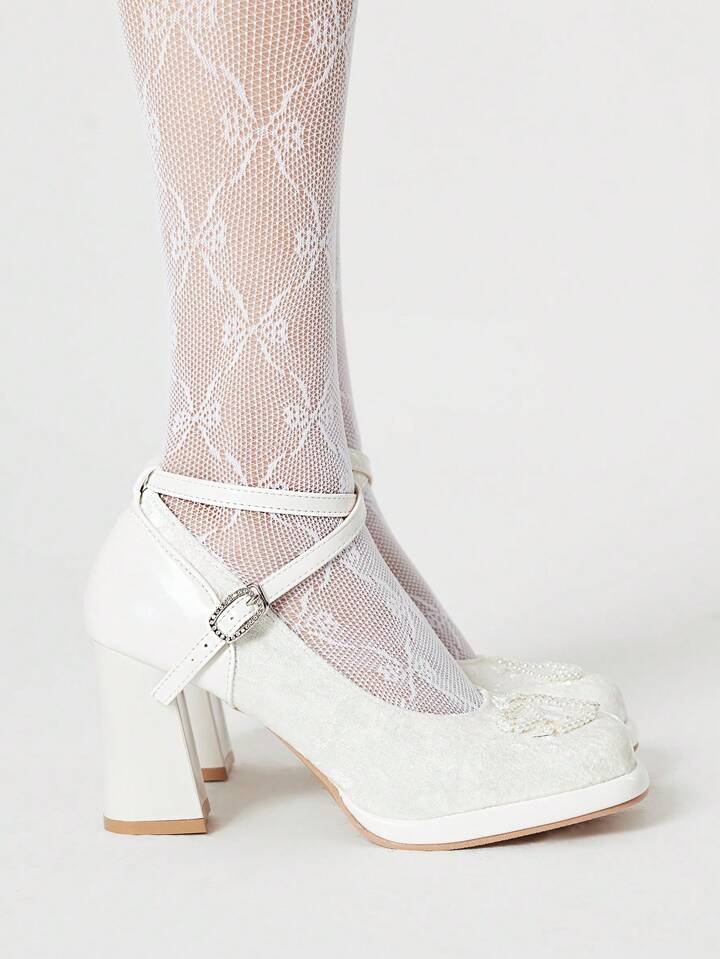 Women Shoe White High Heels Closed Toe Waterproof Platform Chunky Heels Sexy Pearl Strap Dress Shoes Low Heel Formal Work Shoes Women's High Heel Shoes