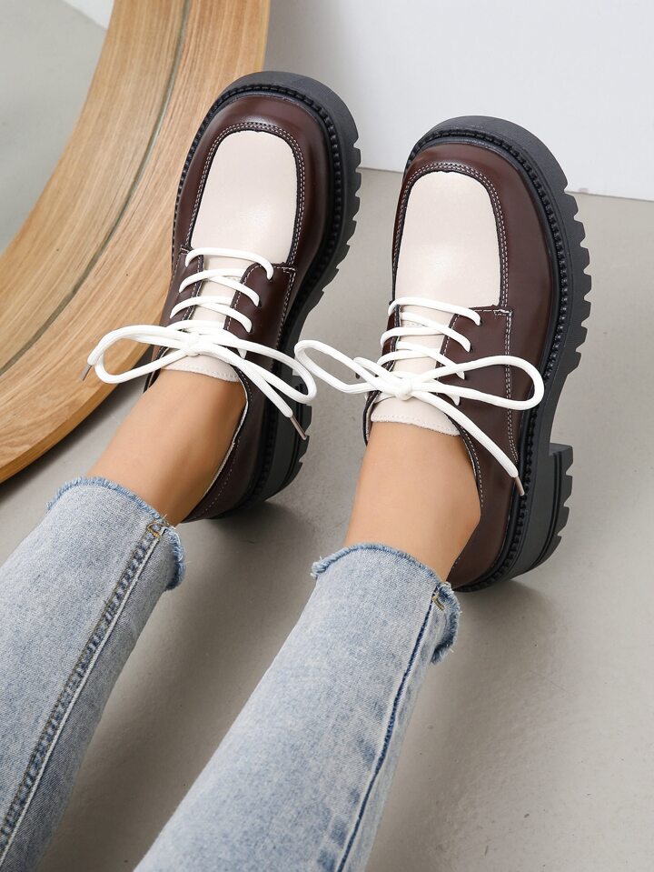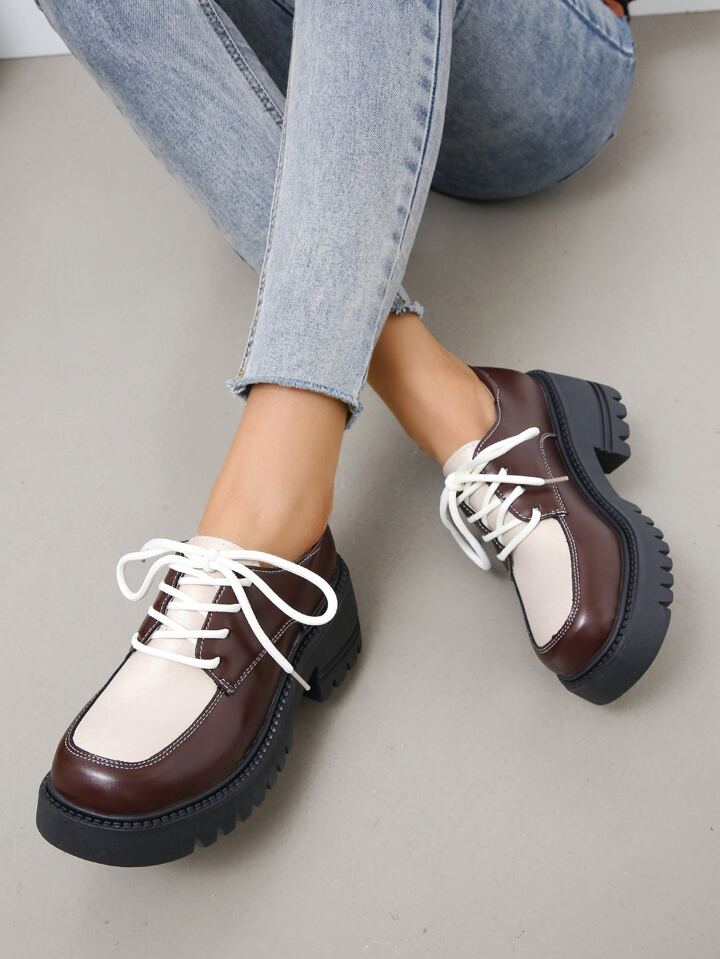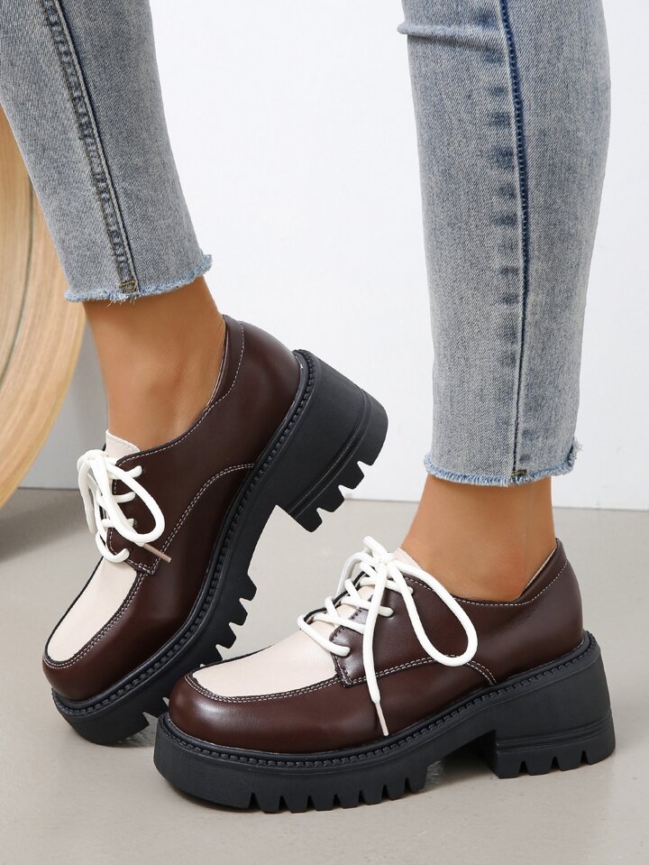 Women Two Tone Lace-up Front Flatform Shoes, Preppy Outdoor Oxford Shoes