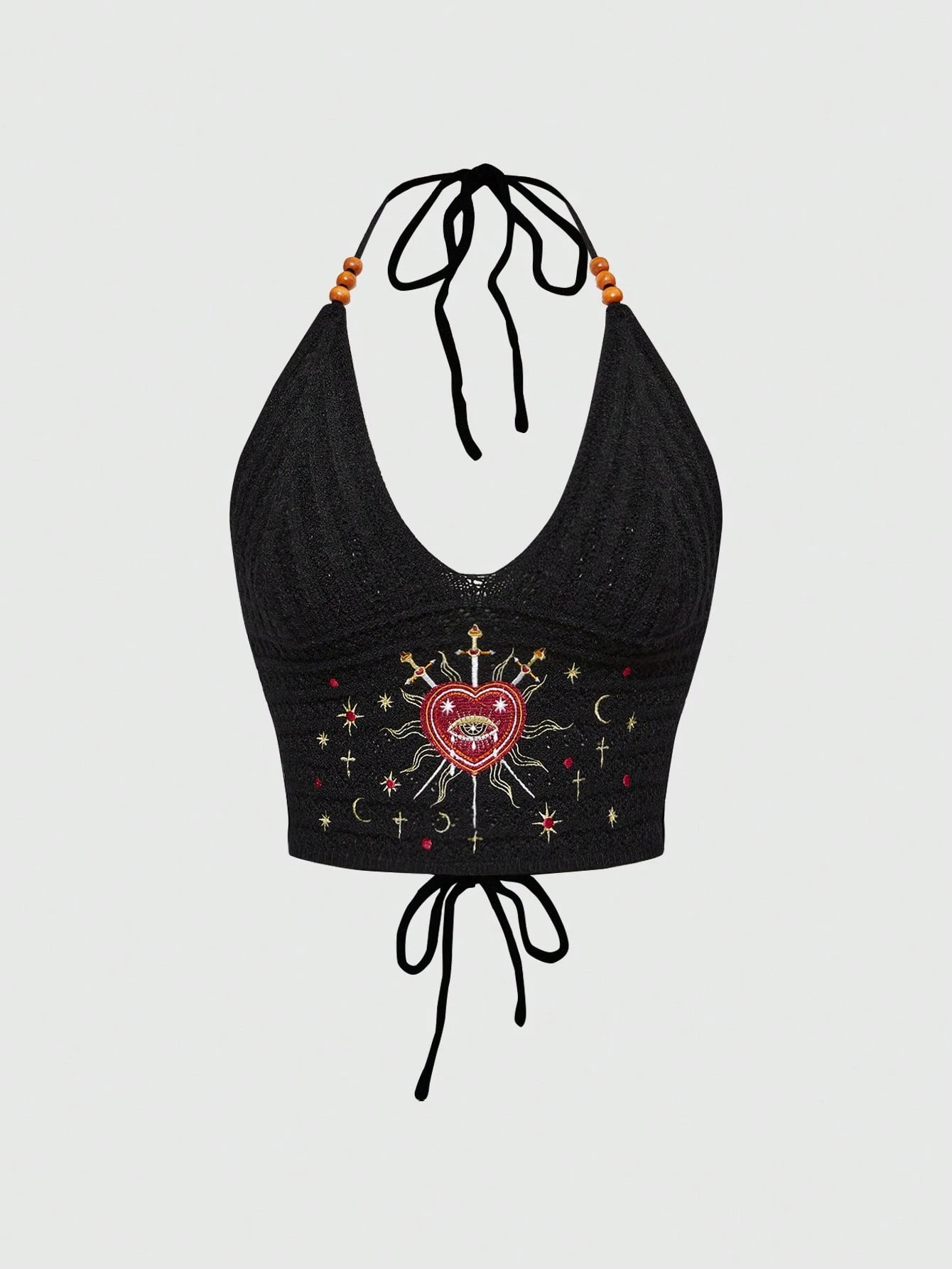 Women's Bohemian Gothic Hippie Vacation Style Heart, Moon & Star Embroidery Black Knit Beaded Top