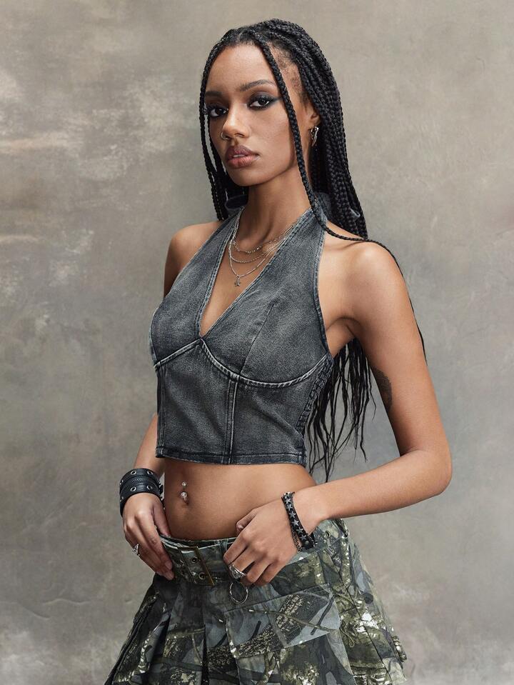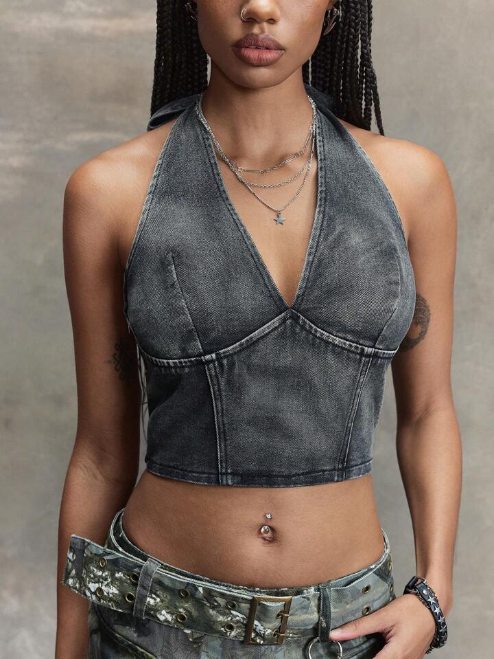 Women's Casual Cropped Halter Neck Denim Crop Top Women's Concert Costumes, Rave Costumes, Carnival Costumes, Country Concert Costumes