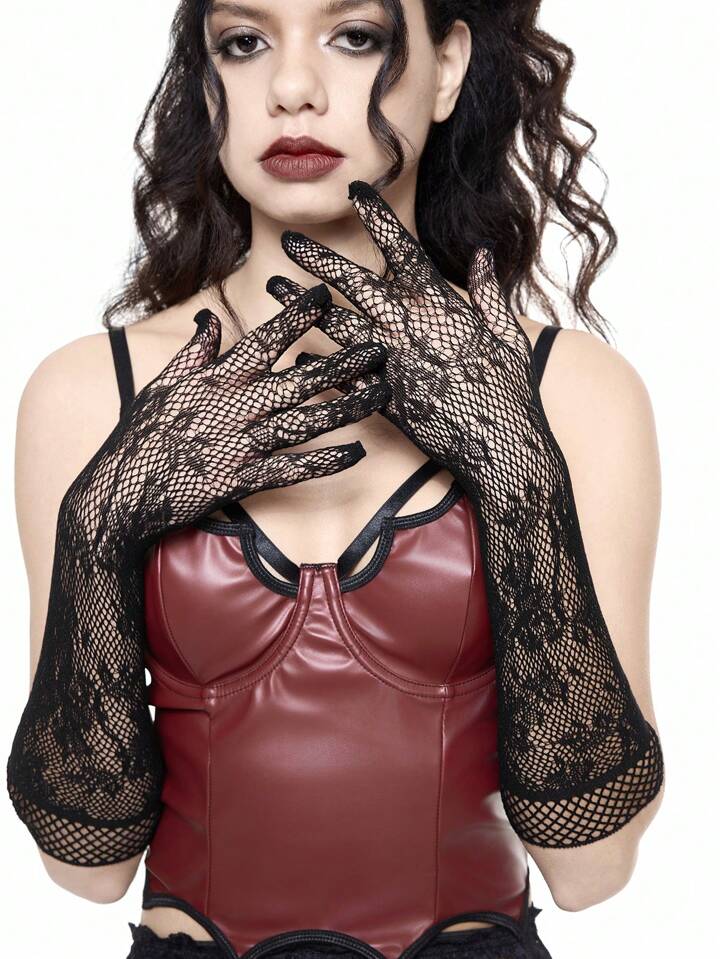 Women's Elastic Gothic Style Fishnet Lace Over-The-Elbow Five Finger Gloves