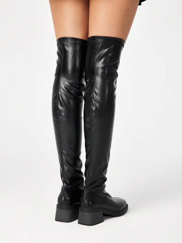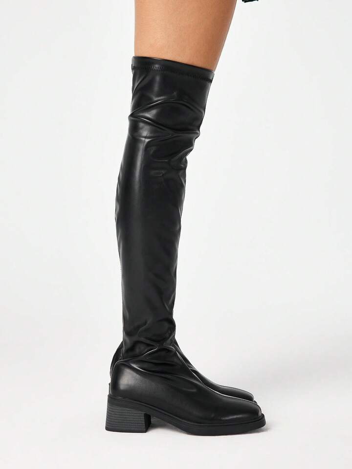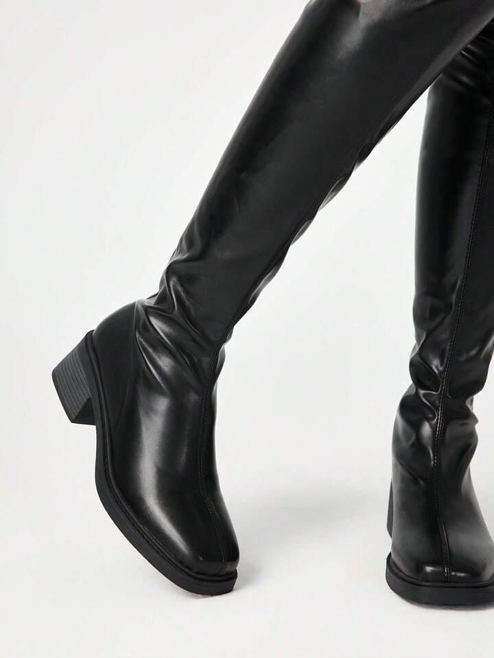 Women's Fashion Solid Color High Heel Square Toe Knee-High Boots