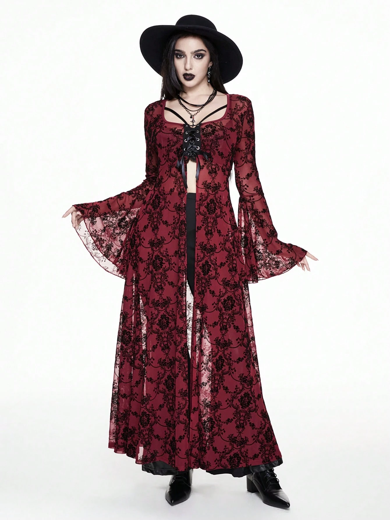 Women's Gothic Vintage Floral Flocked Flare Sleeve Dress, For New Year