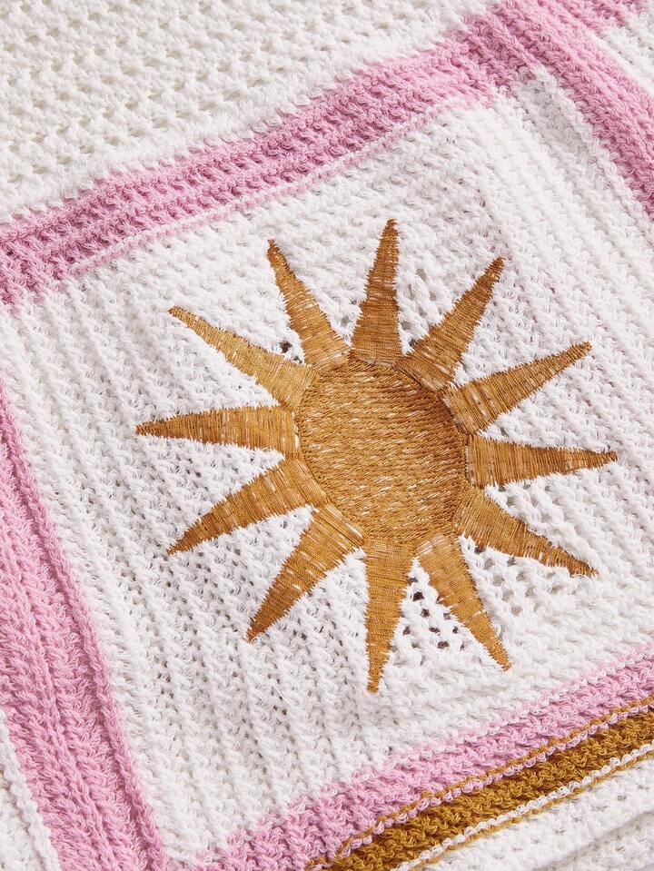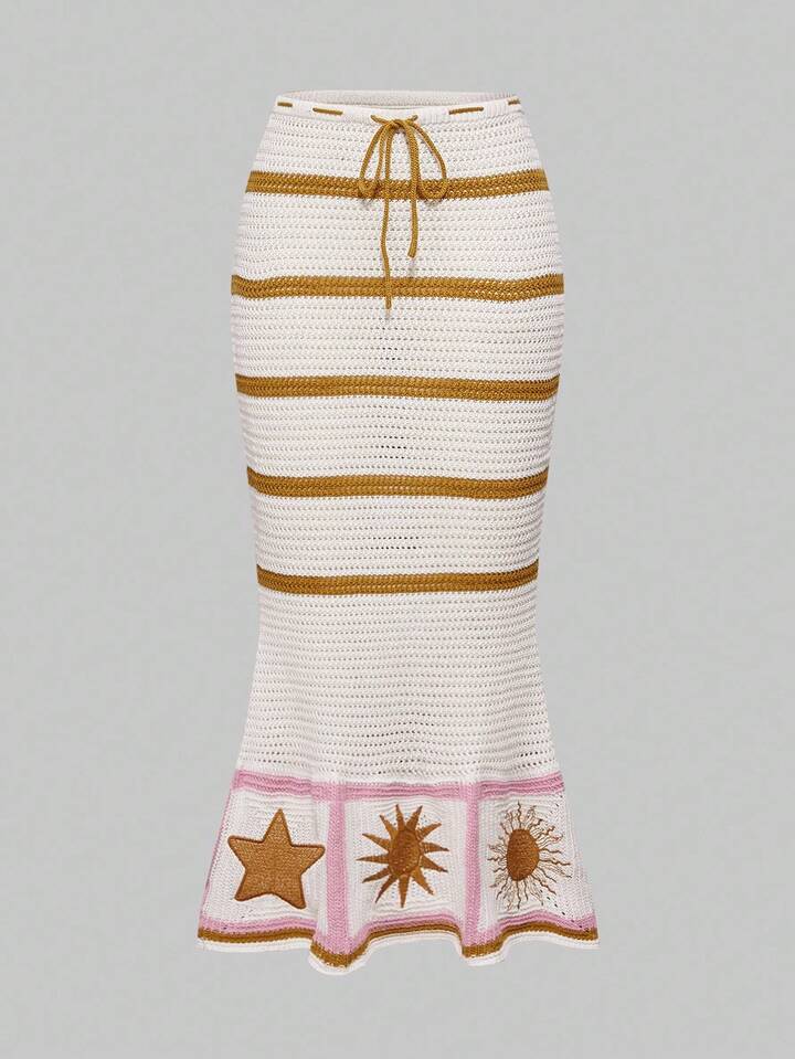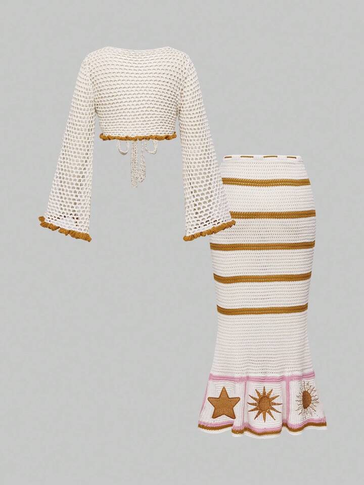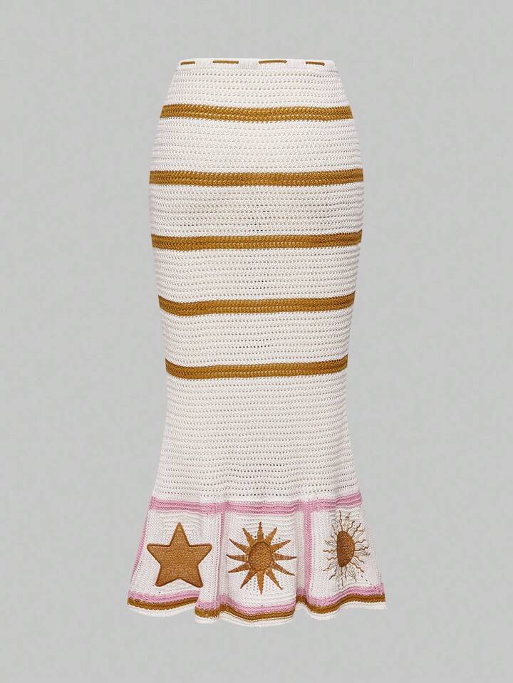 Women's Hippie Bohemian Style Embroidered Blouse Paired With Moon & Star Printed Mermaid Skirt