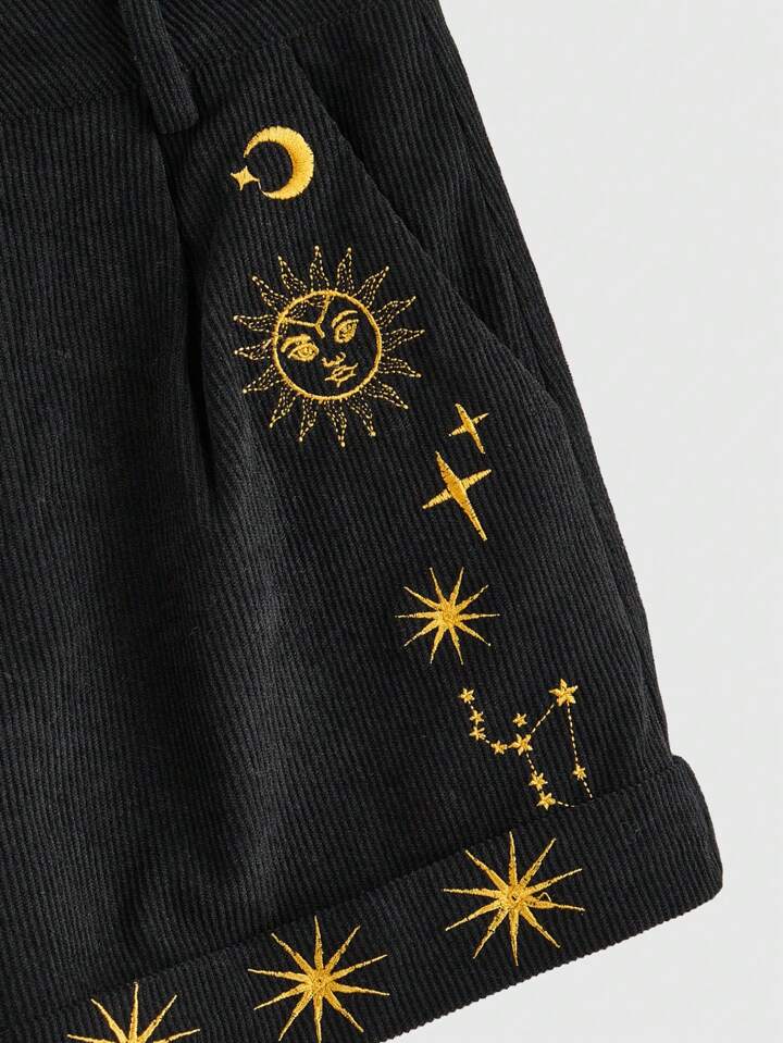 Women's Hippie Style Star Moon Embroidery Black Shorts