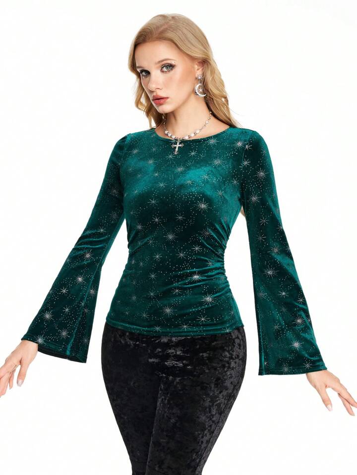 Women's Hippie Velvet Gold Foil Star Flare Sleeve T-Shirt