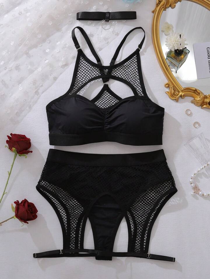 Women's Punk/Y2K Contrast Fishnet Cut Out Ruched Lingerie Set