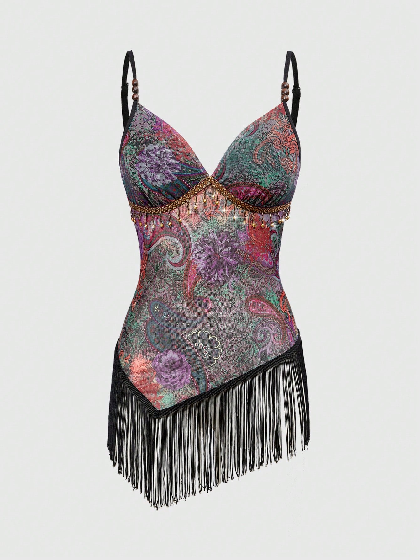 Women's Retro Hippie Western Music Festival Paisley Print Backless Bead & Tassel Hem Halter Top