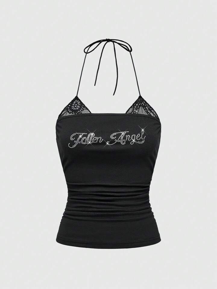 Women's Rhinestone Embellished 2 In 1 Lace Trim Halter Neck Camisole