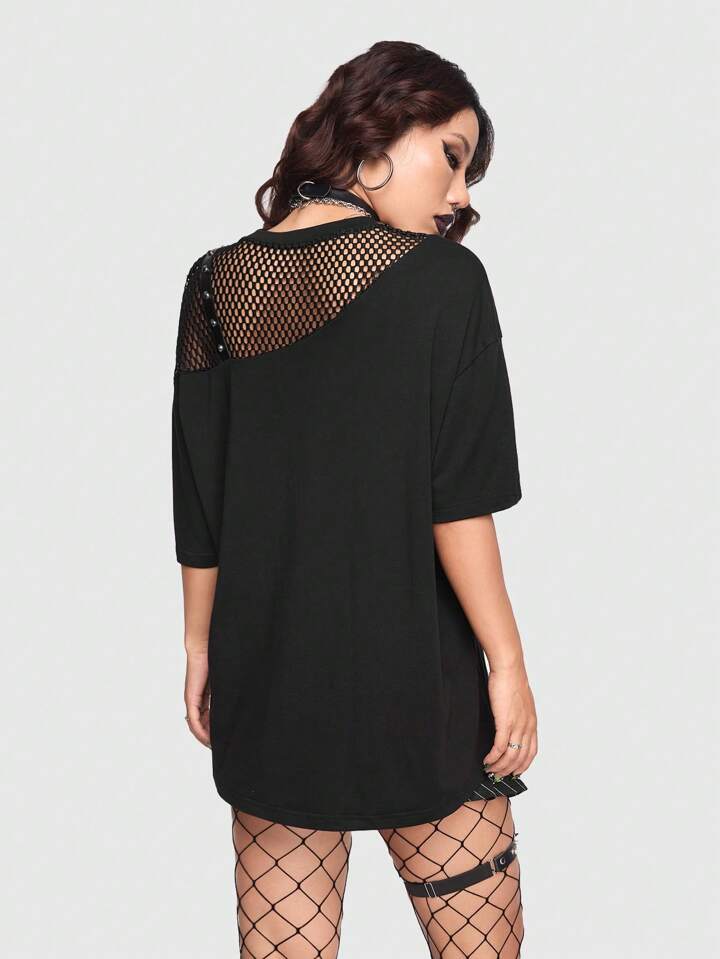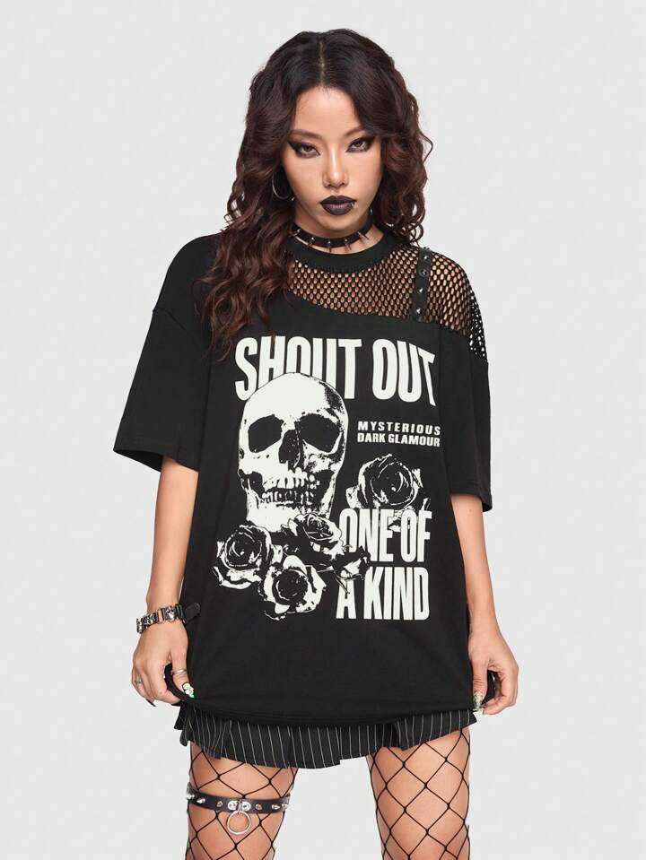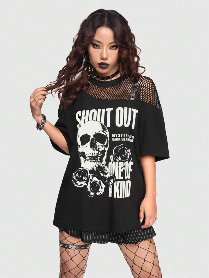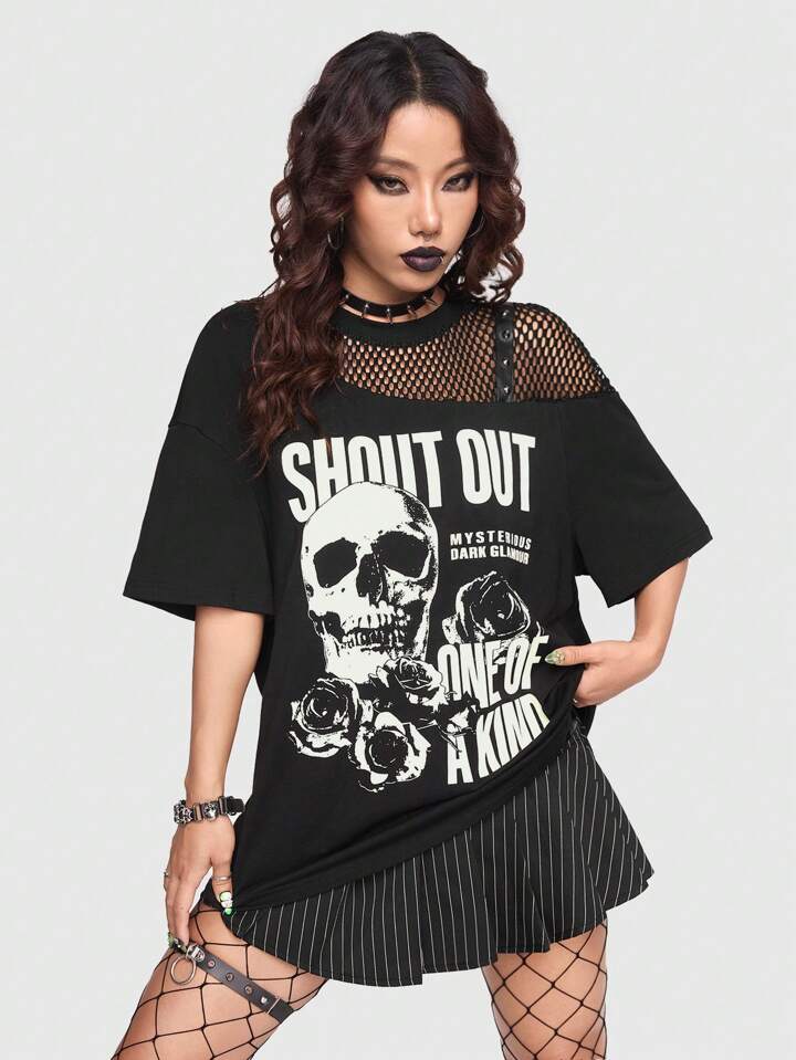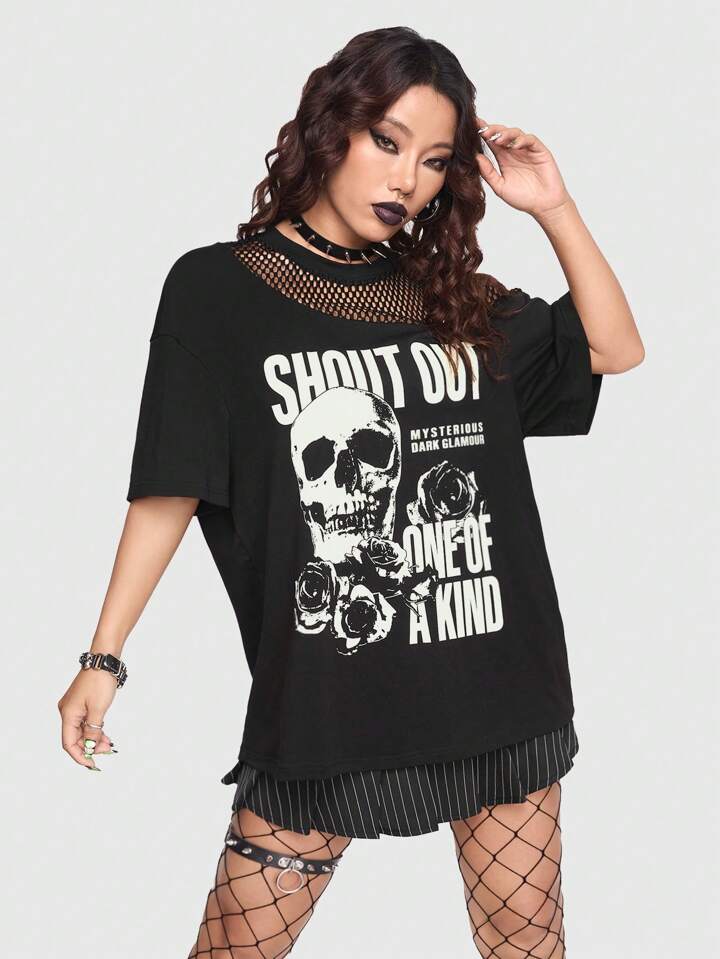 Women's Skull And Slogan Printed Fishnet Insert T-Shirt