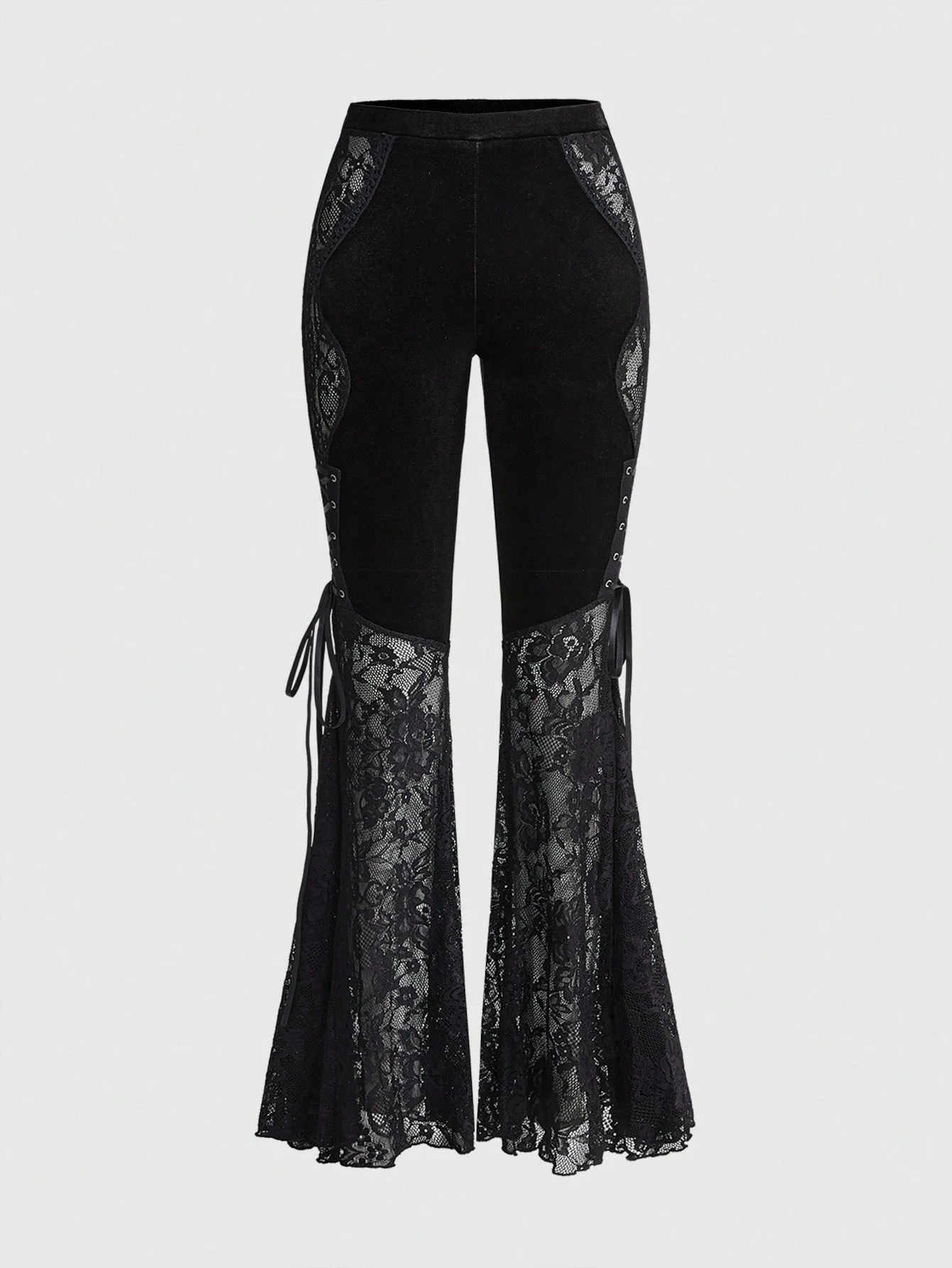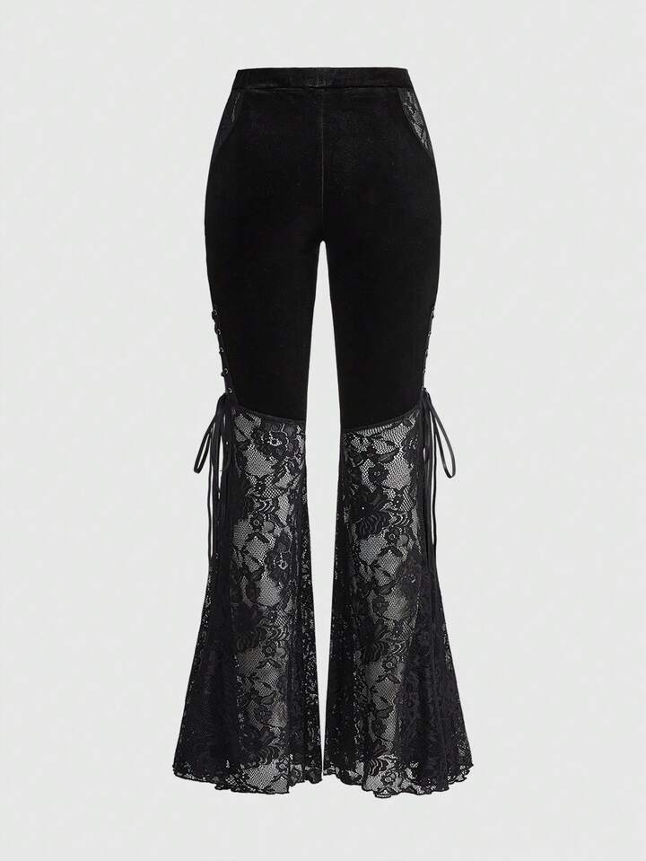 Women's Vintage Gothic Dark Mysterious Romantic Palace Lace Patchwork Tie-Up Sheer Velvet Flare Pants