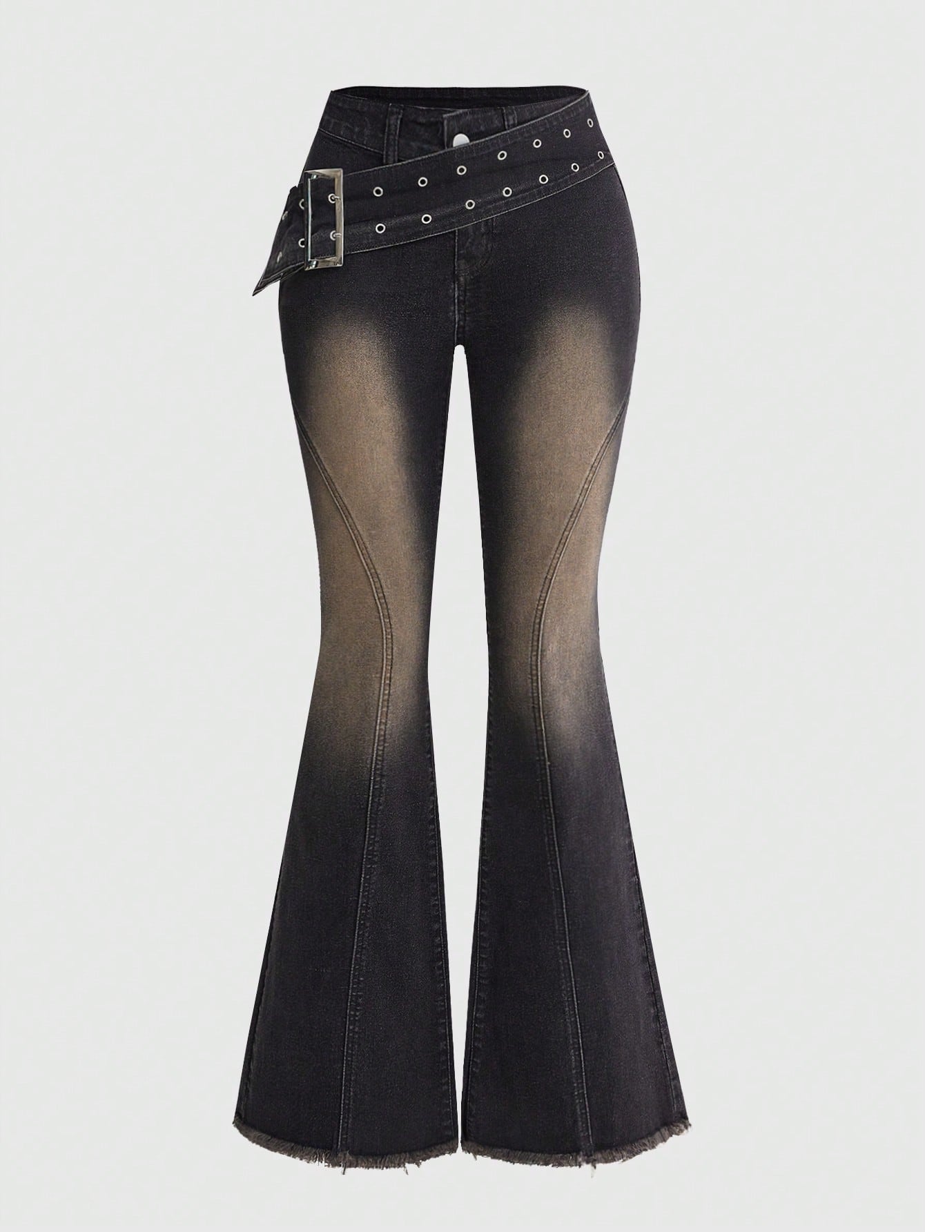 Women's Vintage Punk Y2K Metal Buckle Waist Belt Frayed Hem Flare Leg Low Waist Distressed Denim Jeans, Suitable For School, Casual Occasions, Music Festivals, Valentine's Day, Shopping Dates, Daily Commute. Low Waist Flare Leg Jeans, Fitted Low Waist Denim Pants, Casual Wear For Spring And Summer