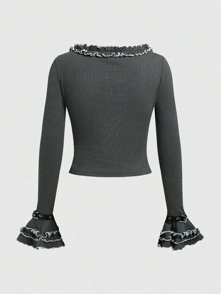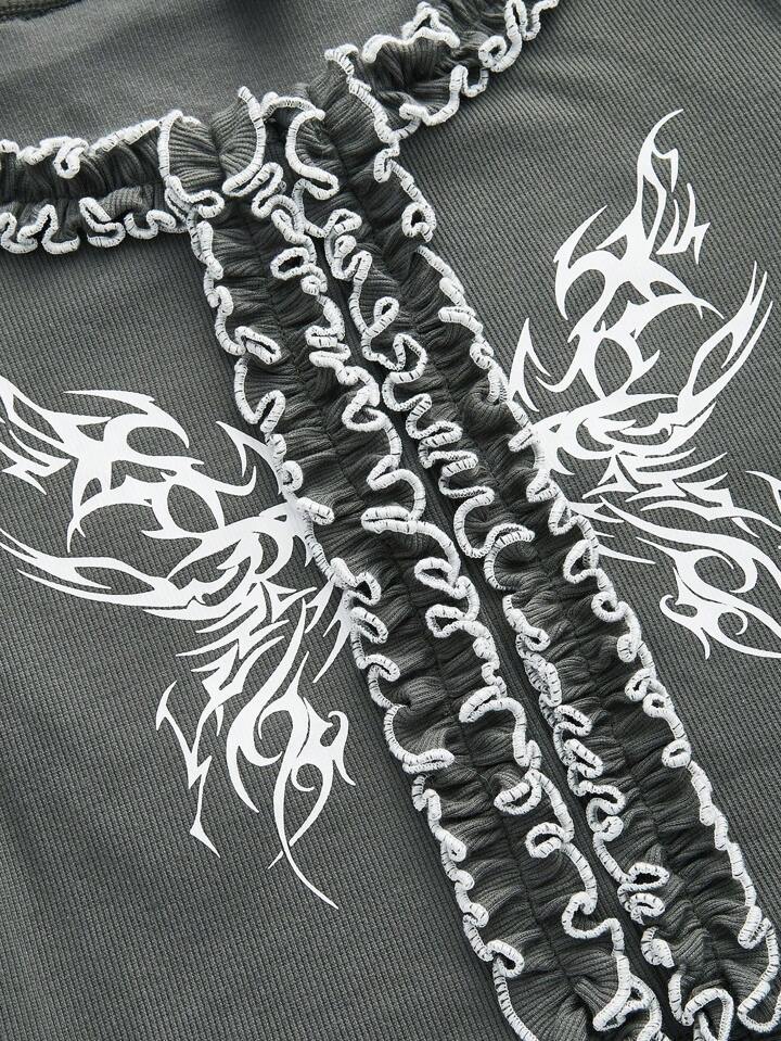 Women's Wing Printed Frill Trim Flounce Sleeve T-shirt