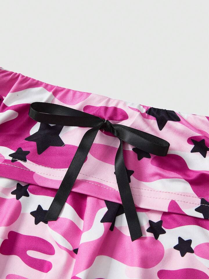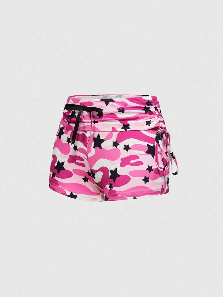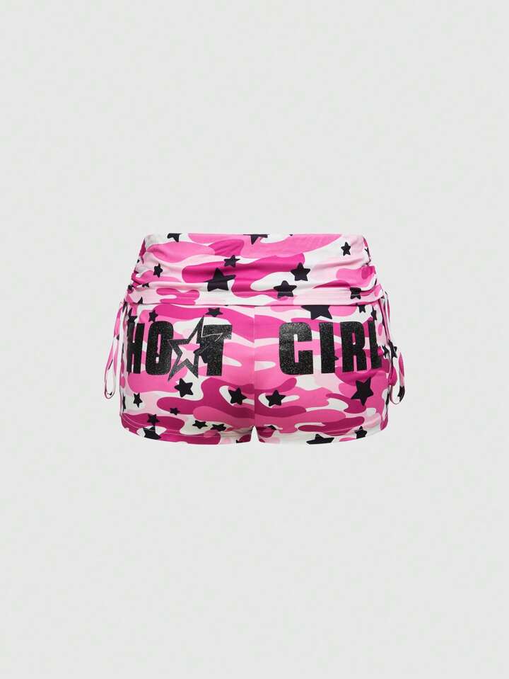 Y2K Style Low Waist Ultra Short Women's Drawstring Camo & Star Letter Print Shorts