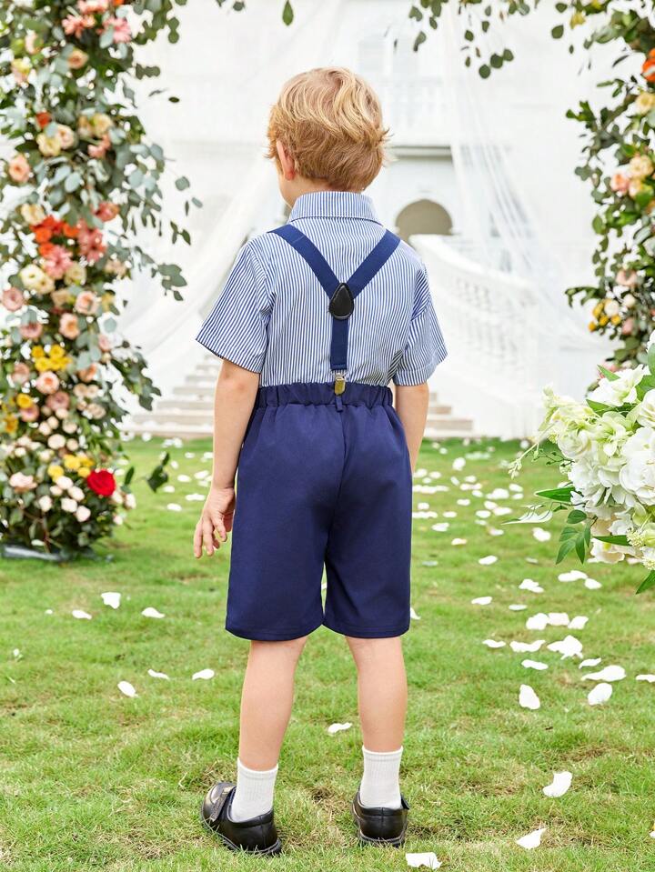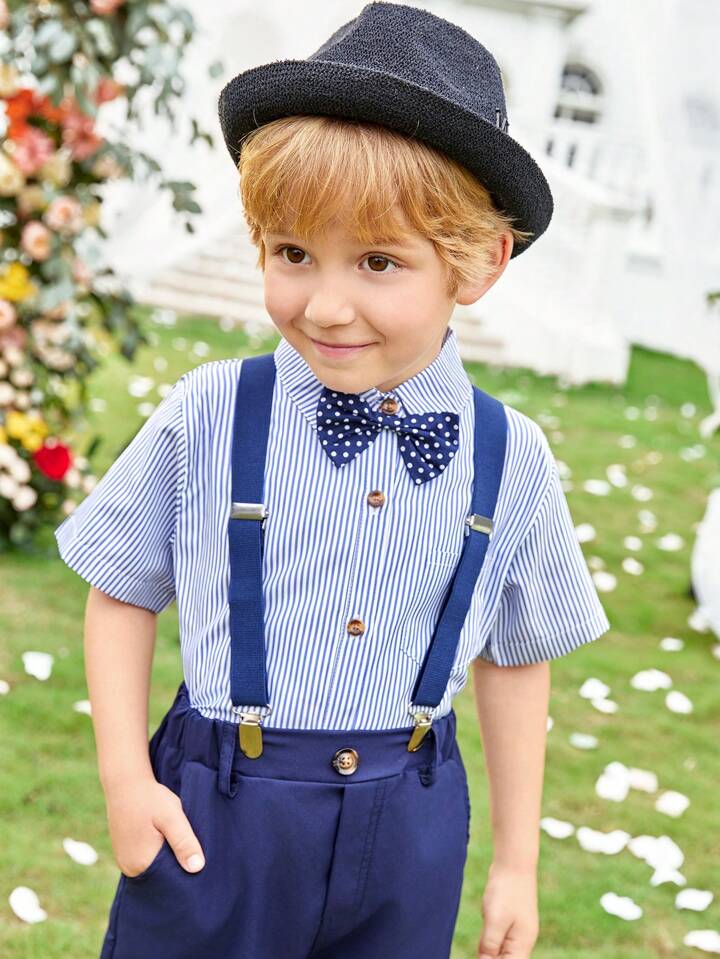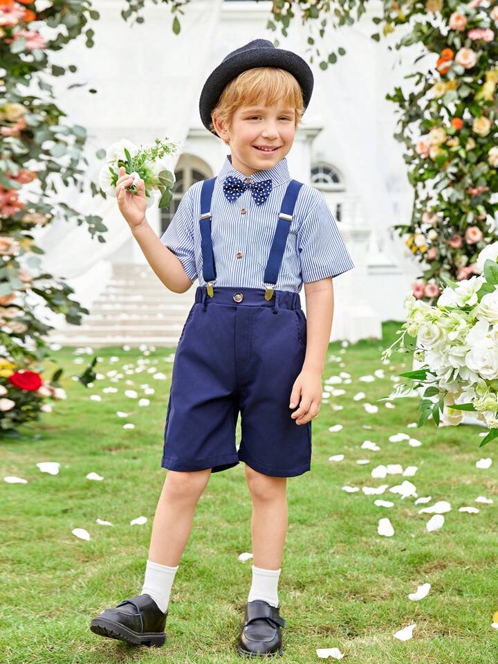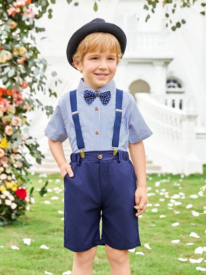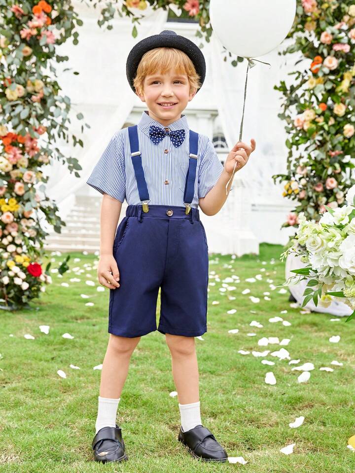 Young Boy Bow Neck Stripe Shirt & Suspender Shorts