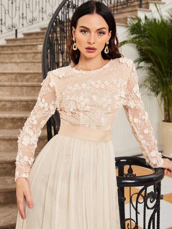 Zipper Back Applique Detail Sheer Mesh Overlay Dress Elegant Long Sleeve Formal Evening Prom Wedding Guest Gown, For Graduation, Dinner Party Dress