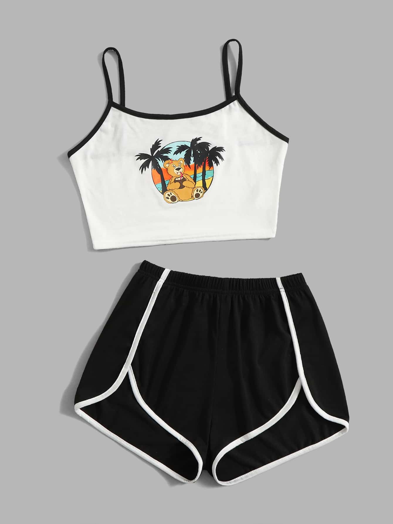 audfish Cartoon Bear Print Contrast Binding PJ Set