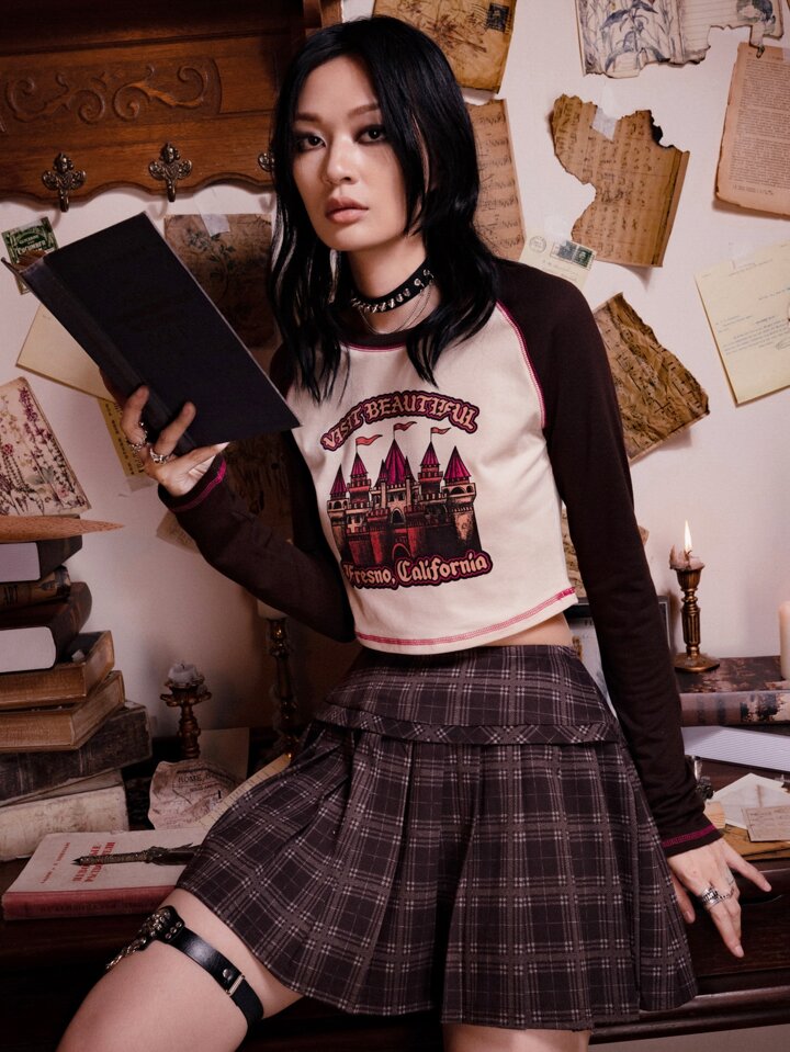 kmintern Dark Academia Stitching Trim Letter Graphic Colorblock Crop Tee