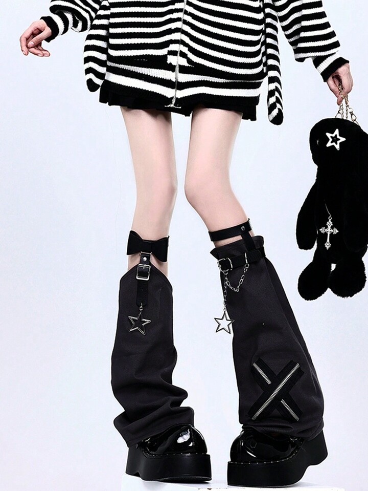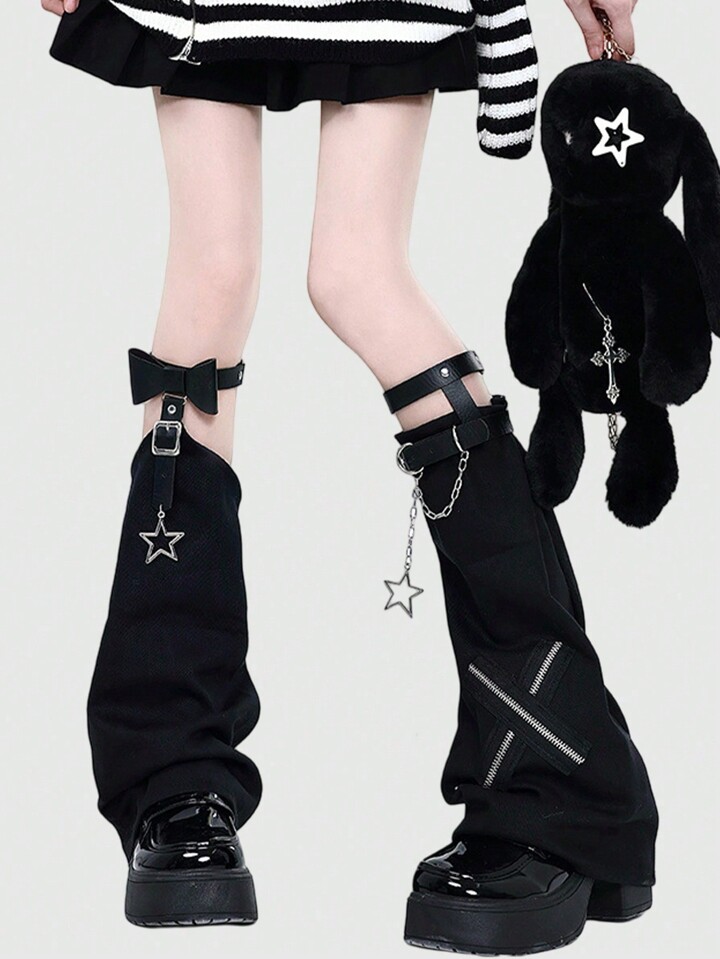 1 Pair Punk Style Leg Warmers, Dark Fashion Goth Leg Sleeves With Straps & Flared Cuff, & Slimming, Suitable For Daily Wear And Party, With Metal Buckle Belt Decor