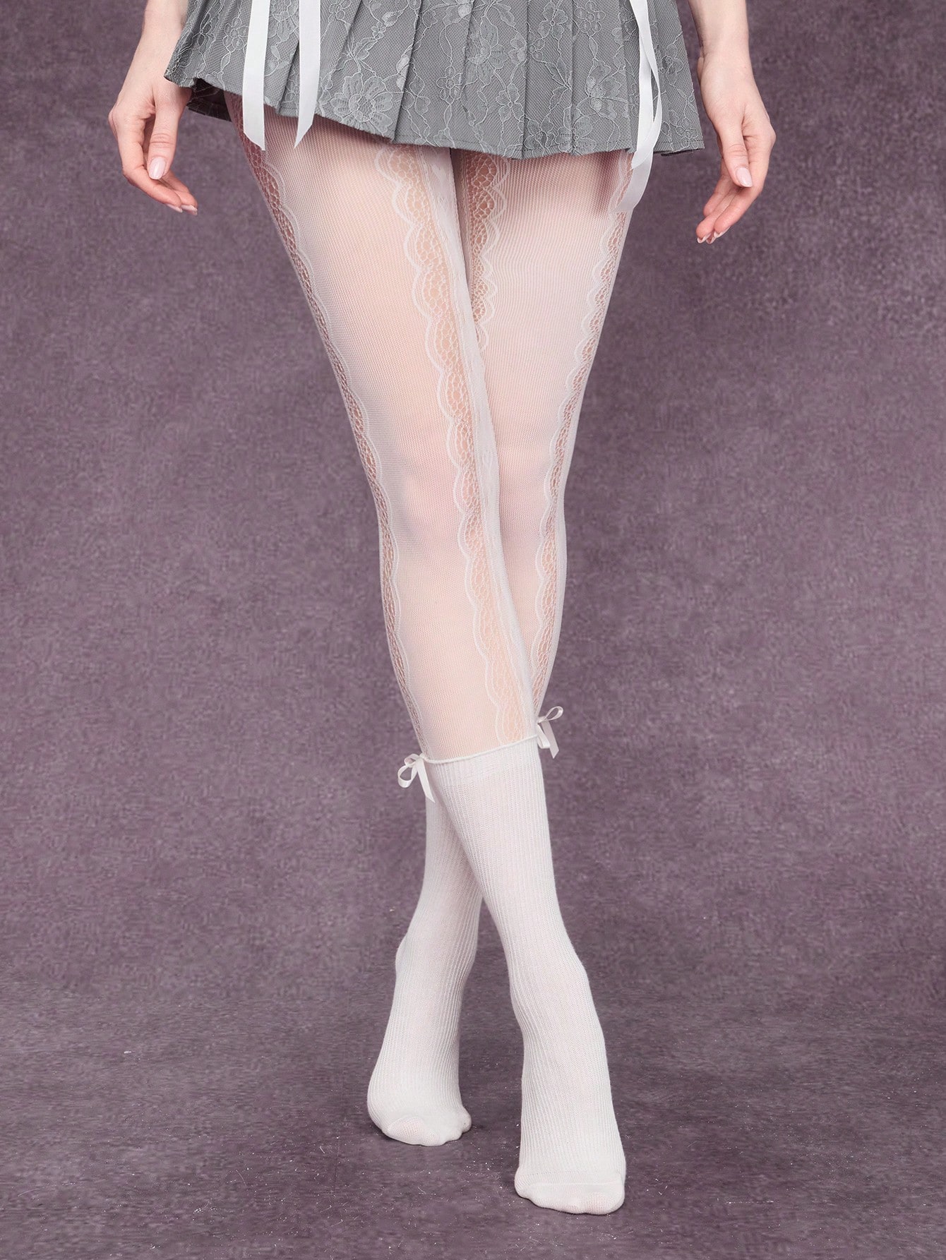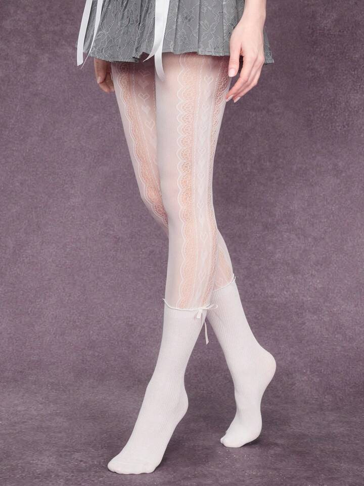 1 Pair Women Kawaii White Hollow Heart Patchwork Bow Mid-Calf Stockings, For All Seasons