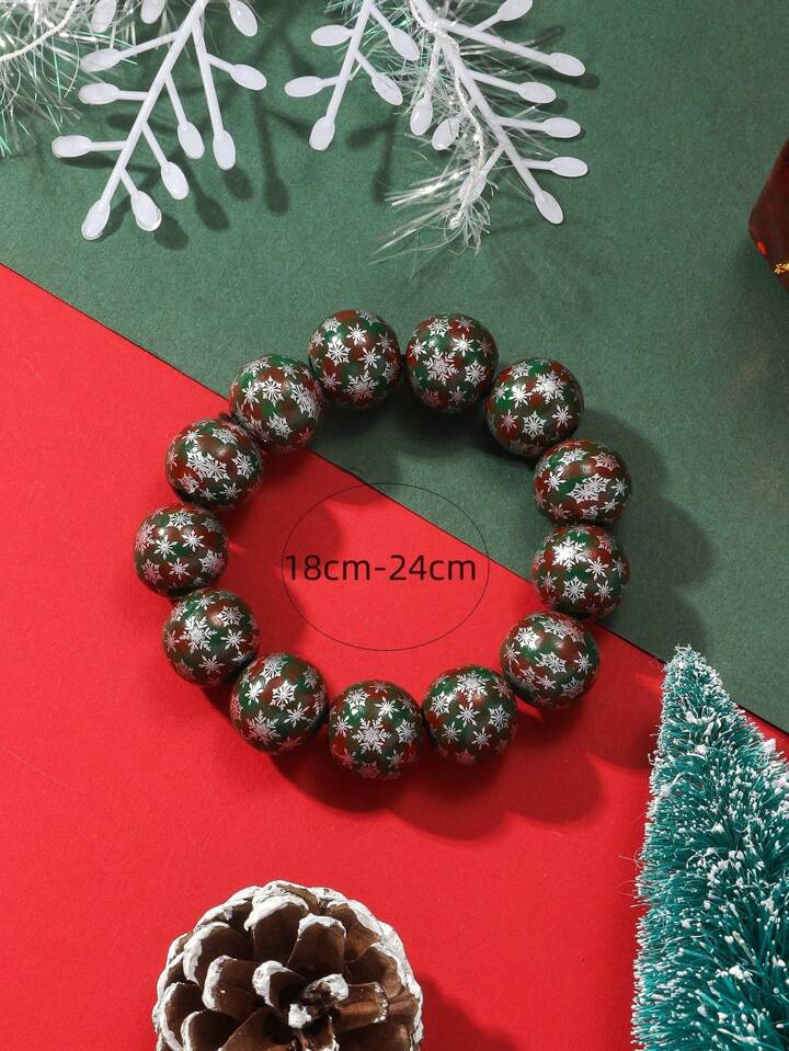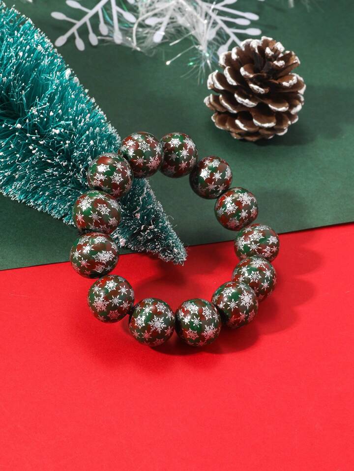 1 Piece Of Creative Personalized Plaid Silver Snowflake Print Wooden Beads Beaded Elastic Bracelet