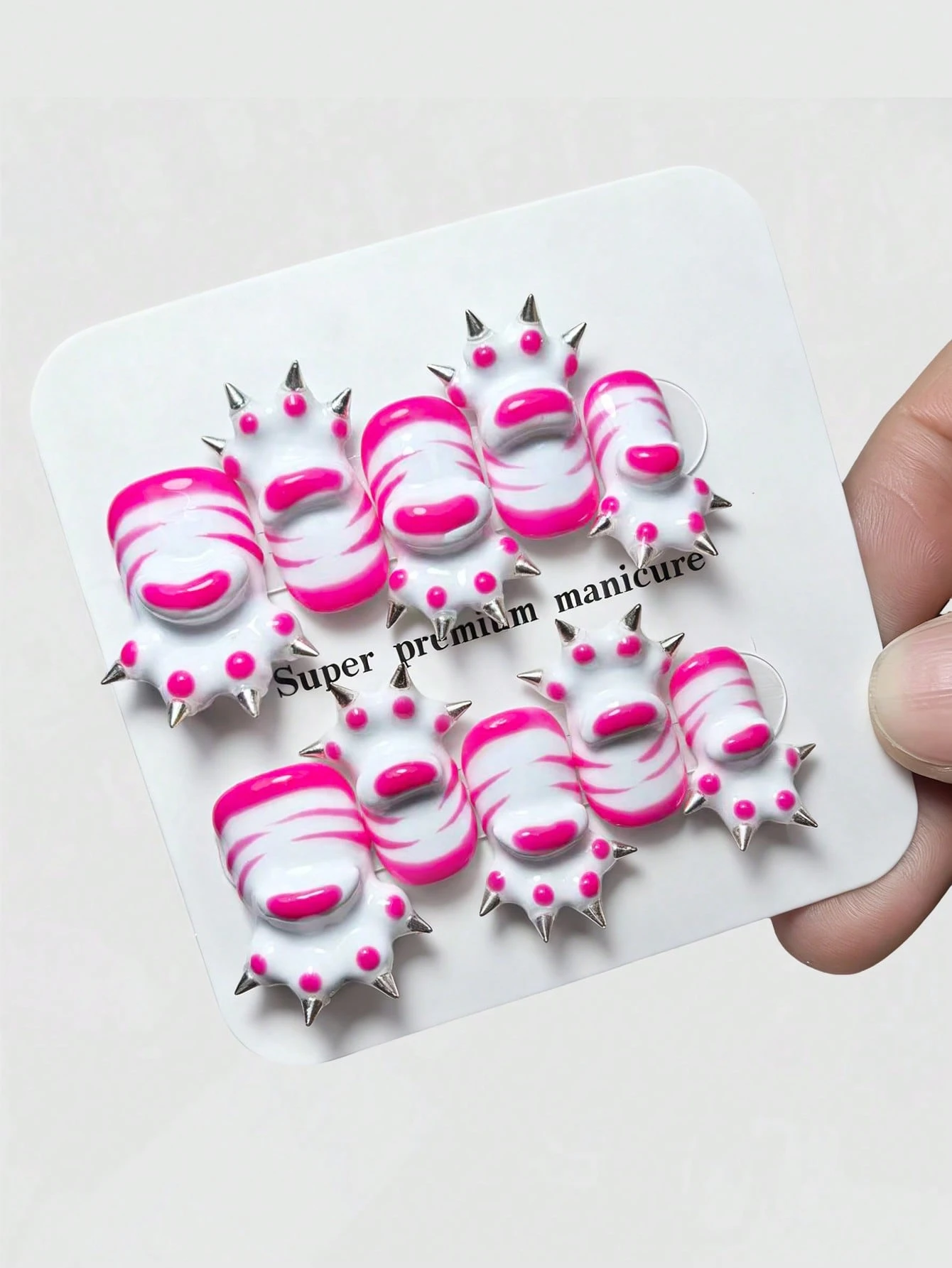 10 Pieces Of Cute Style Cat Paw Hand-Painted Manicure + 3 Pieces Of Double-Sided Tape, Y2K High-Quality Rivets, Pink And White Press On Nails, Medium-Shaped Nail In All Seasons, Suitable For Daily, Dating, And Party Wear