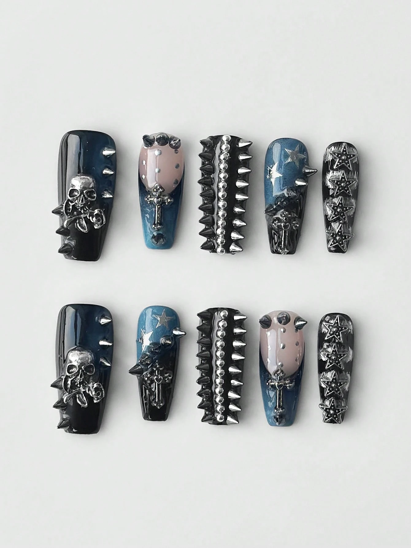 10 Pieces Of Punk Style Rivets To False Nails + 3 Pieces Of Nail Art Double-Sided Tape, Dark High-Quality Black And Blue Gradual Change Handmade Nail Art, Retro Metal Skull, Star Decoration, Reusable Long Coffin-Shaped Fake Nail In Four Seasons, Suitable For Daily, Party, Dance Wear