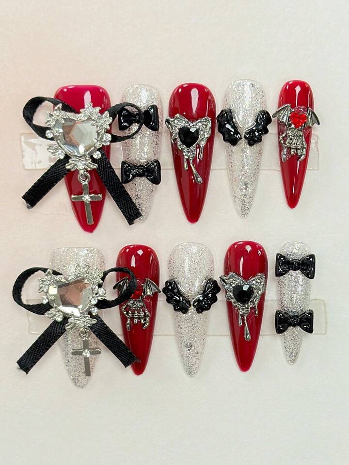 10pcs Gothic-Style Bat Cross Faux Nails Set Comes With 3pcs Adhesive, Y2K Goth Nail Art, Detachable Heart, Wing, Bow Tie Nail Decals With Rhinestones And Ribbon Decor, Suitable For Festival Parties, Dances And Daily Wear