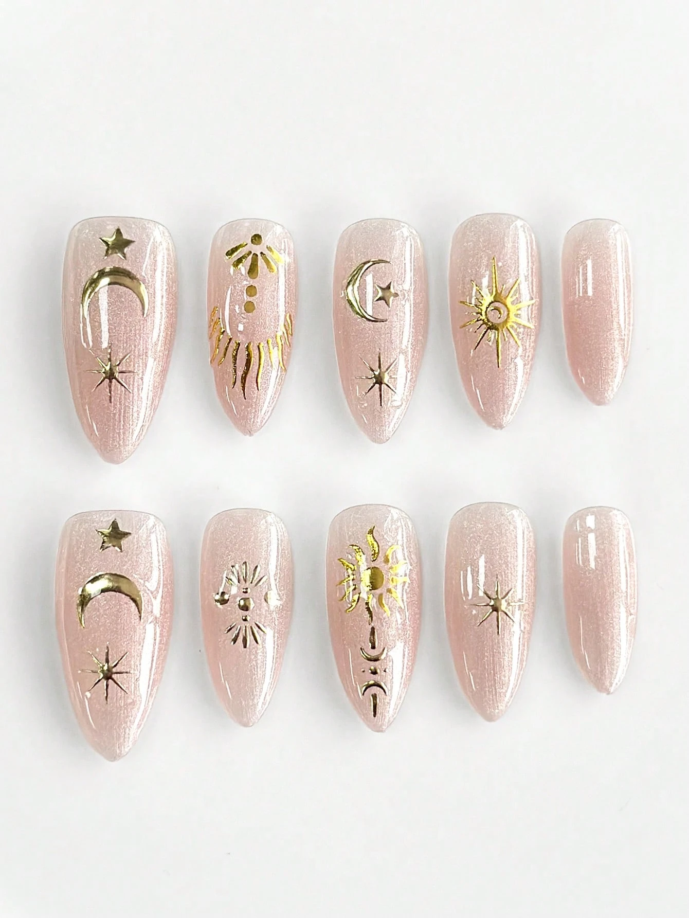 10pcs Hippie Style Sun & Star Handpainted High Quality False Nails + 3pcs Double Sided Adhesive, Removable & Reusable Almond Shape Long Fake Nails, Contrast Color Handpainted Nail Stickers, Suitable For Festivals, Parties, Dancing And Daily Wear