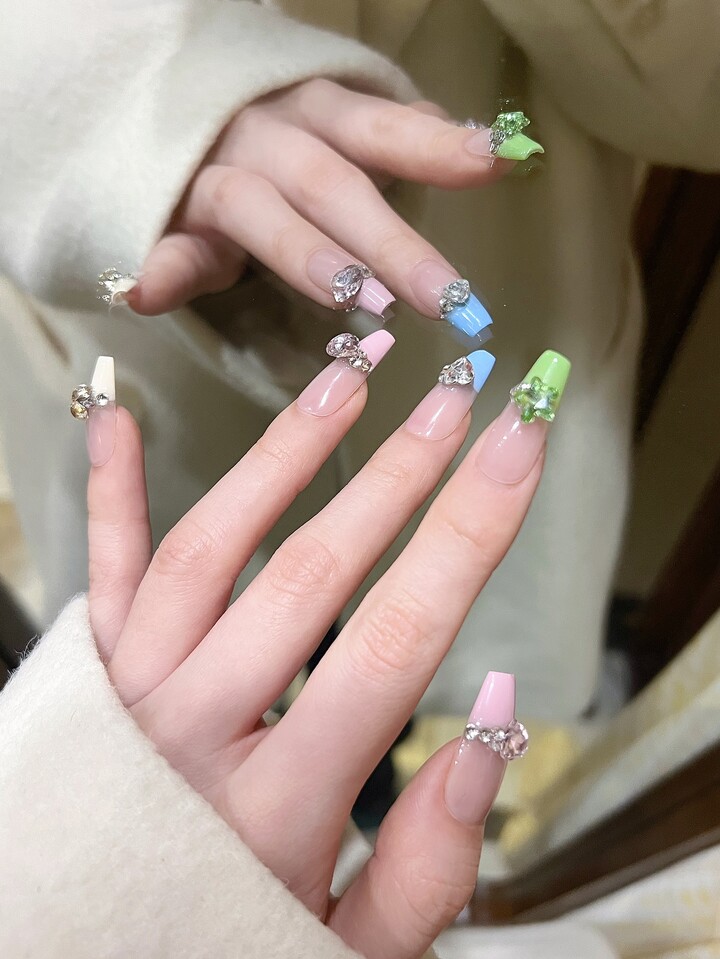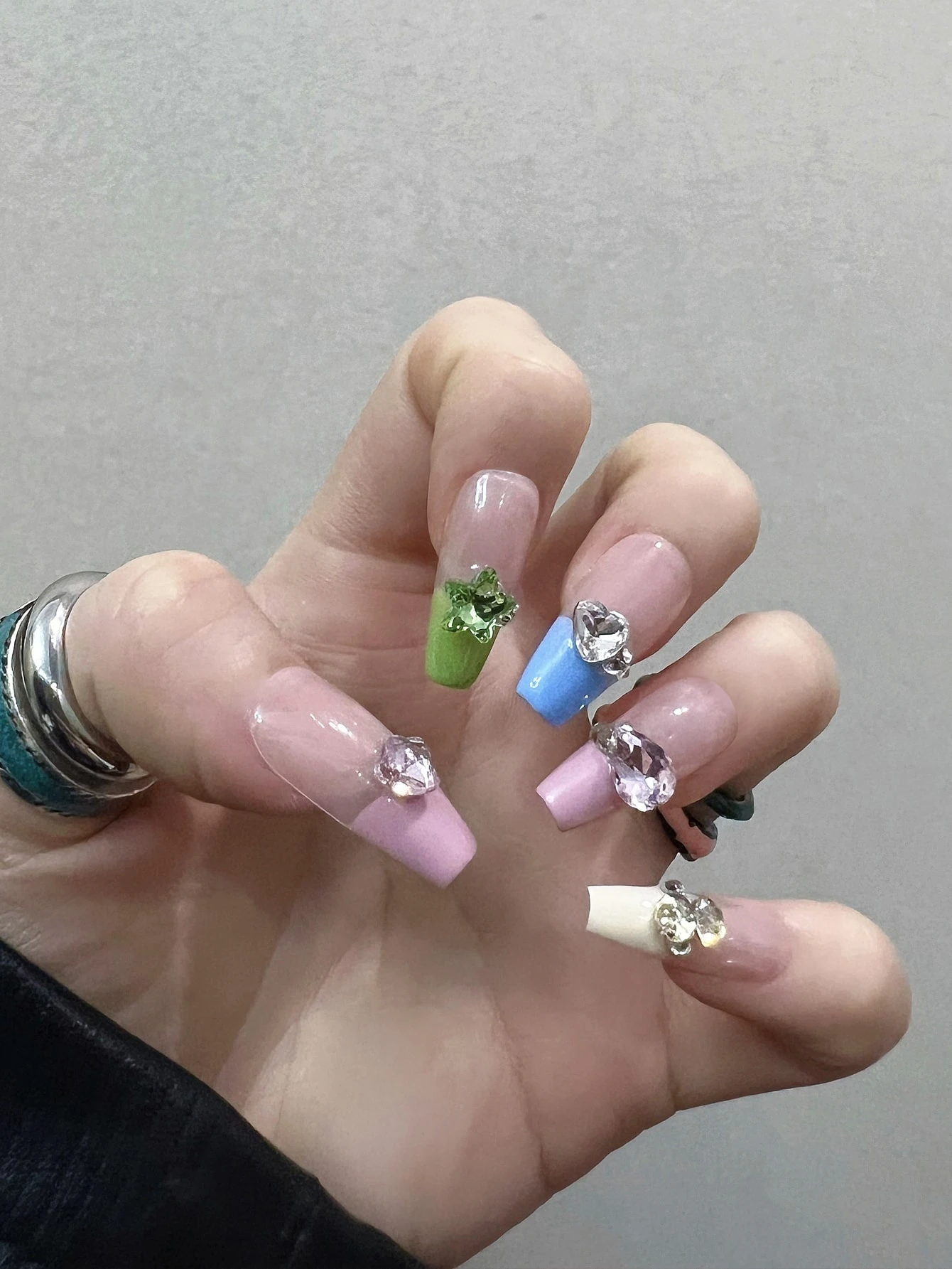 10pcs Long Coffin 3D Heart Decor Fake Nail & 1sheet Tape