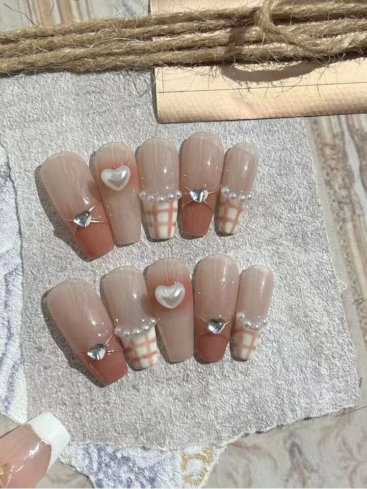 10pcs Long Coffin 3D Heart Decor Fake Nail & 1sheet Tape